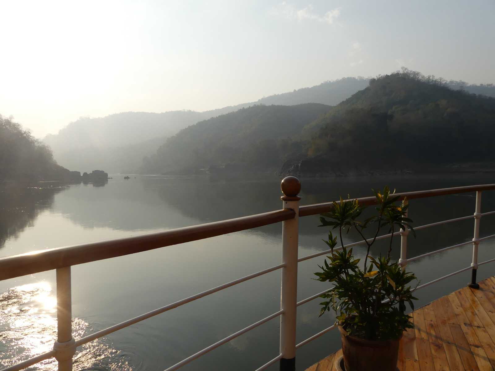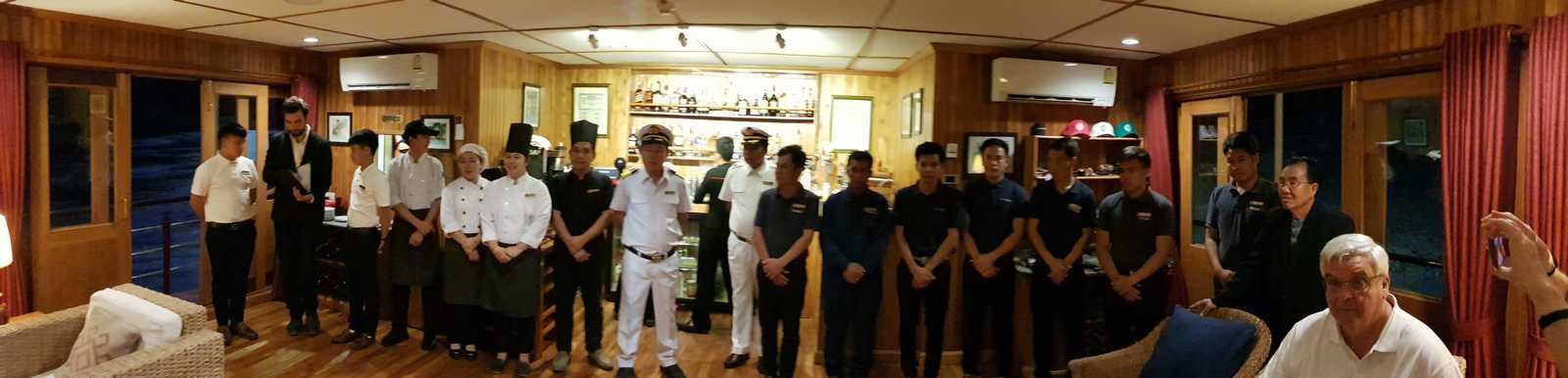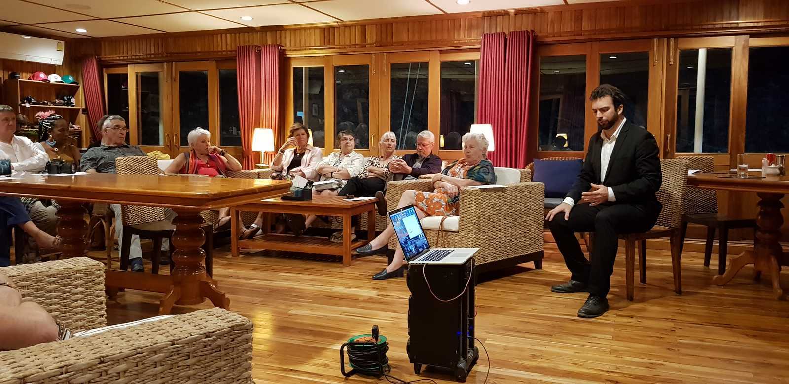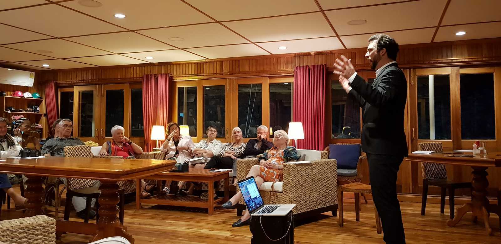(on observe sur le mur des maisons des tags rouges : cela correspond à la surface de la maison : celle-ci va être reconstruite un peu plus haut à l’identique car un barrage est prévu à hauteur des grottes précédemment visitées) - Soirée opéra : quelques airs classiques repris par Thomas HUERTAS notre directeur de croisière