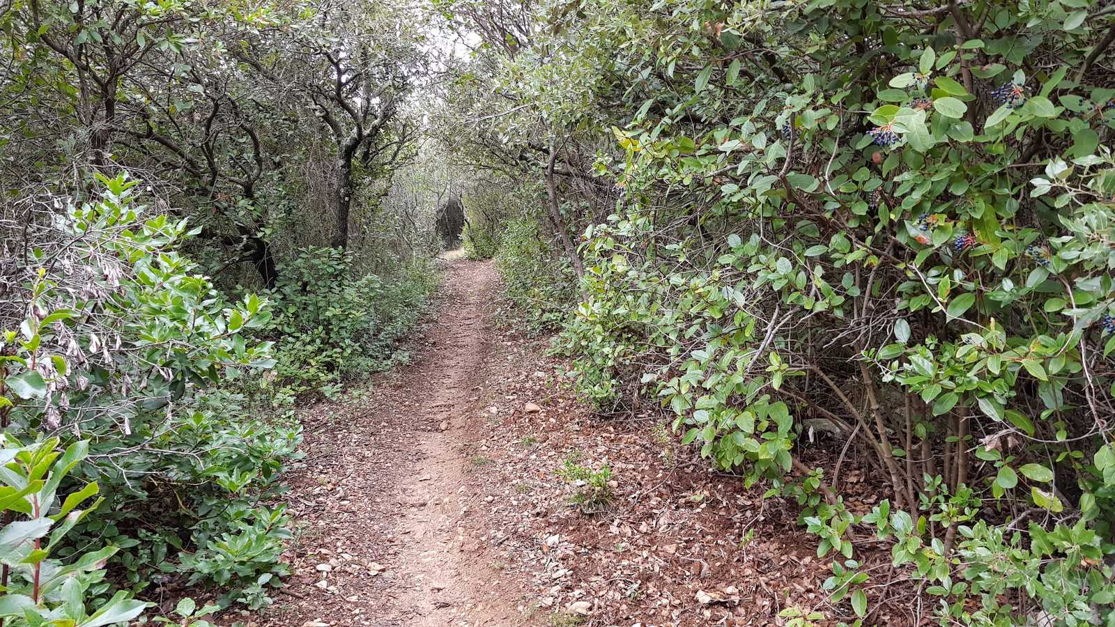 2. Passage délicat au Km 2.6 pour rejoindre l’aven du Matalas à partir du sentier principal bien entretenu (il venait d’être élagué) : le petit sentier de traverse pour rejoindre l’aven est à peine visible (portion en rouge sur la carte IGN ci-dessous) : 300 mètres de galère (jusqu’à l’aven) !!