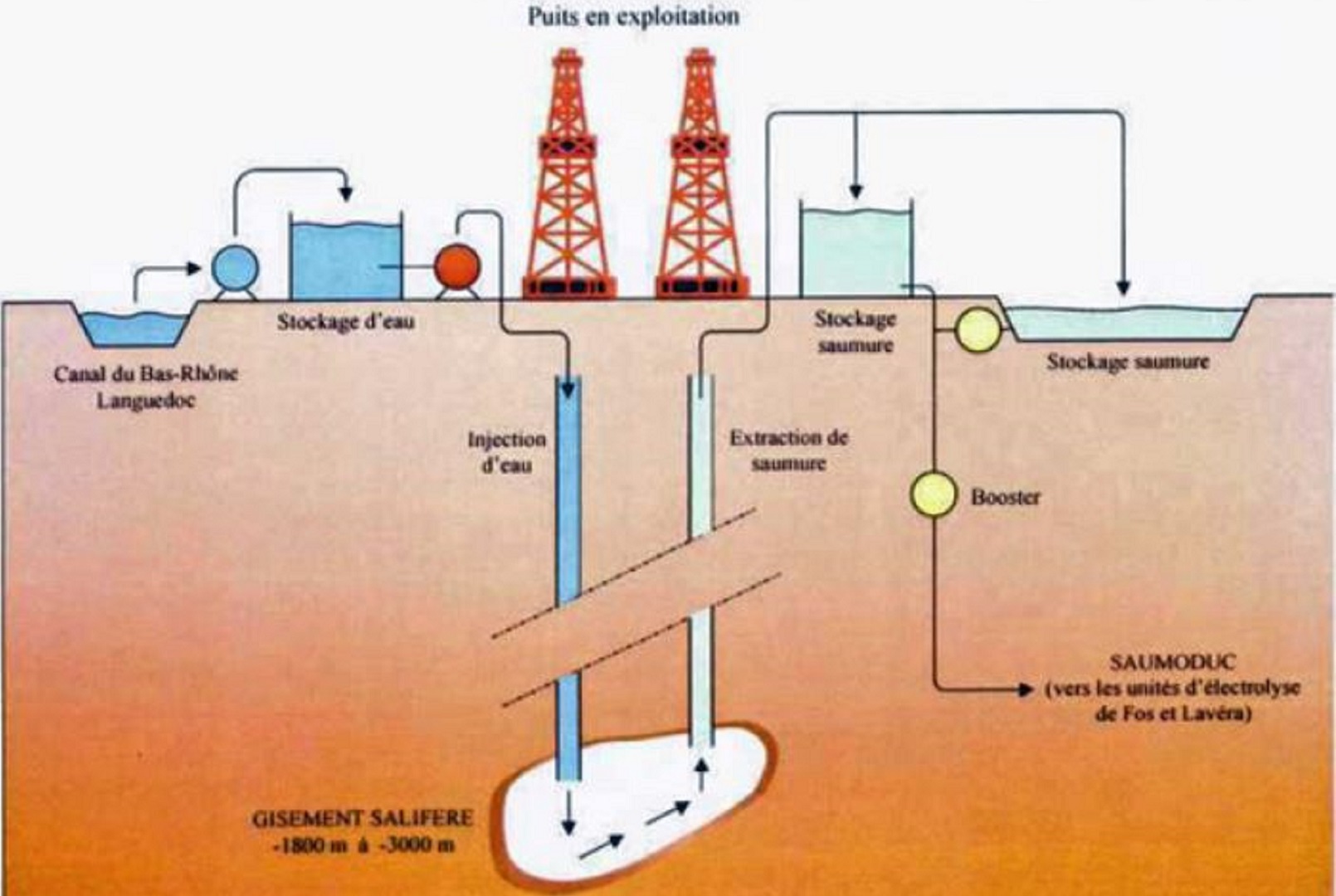 1. Les salines de Vauvert (cf photos et site explicatif) : extraction à 2 500 m de profondeur de 1 million de tonnes de sel par an, transféré par «saumure-duc » vers Fos pour fabriquer du PVC), le bassin d’eau est donc une réserve provenant du canal de Bas-Rhône pour assurer la dilution du sel.
