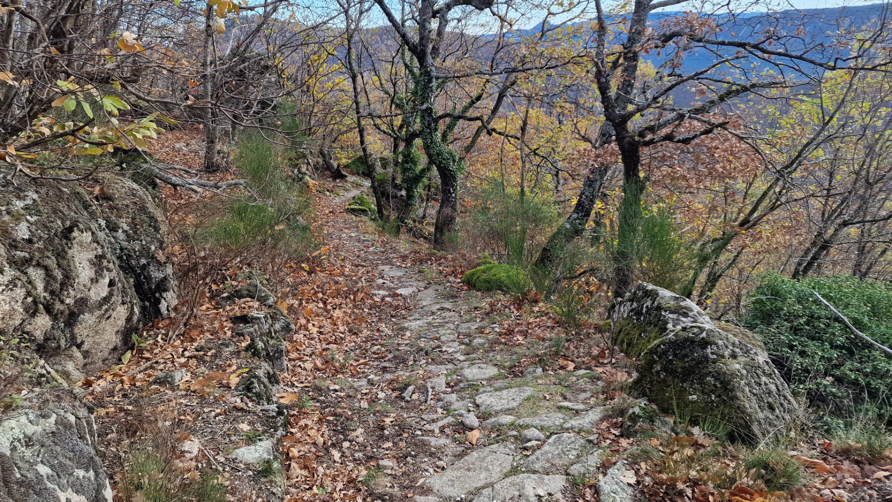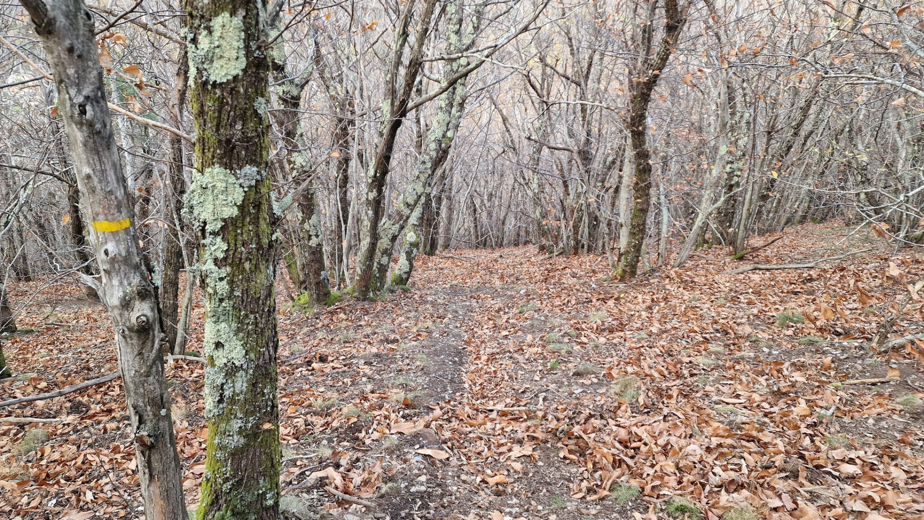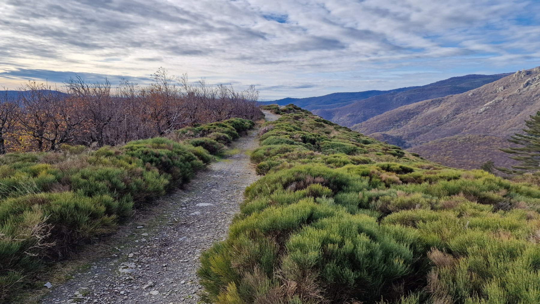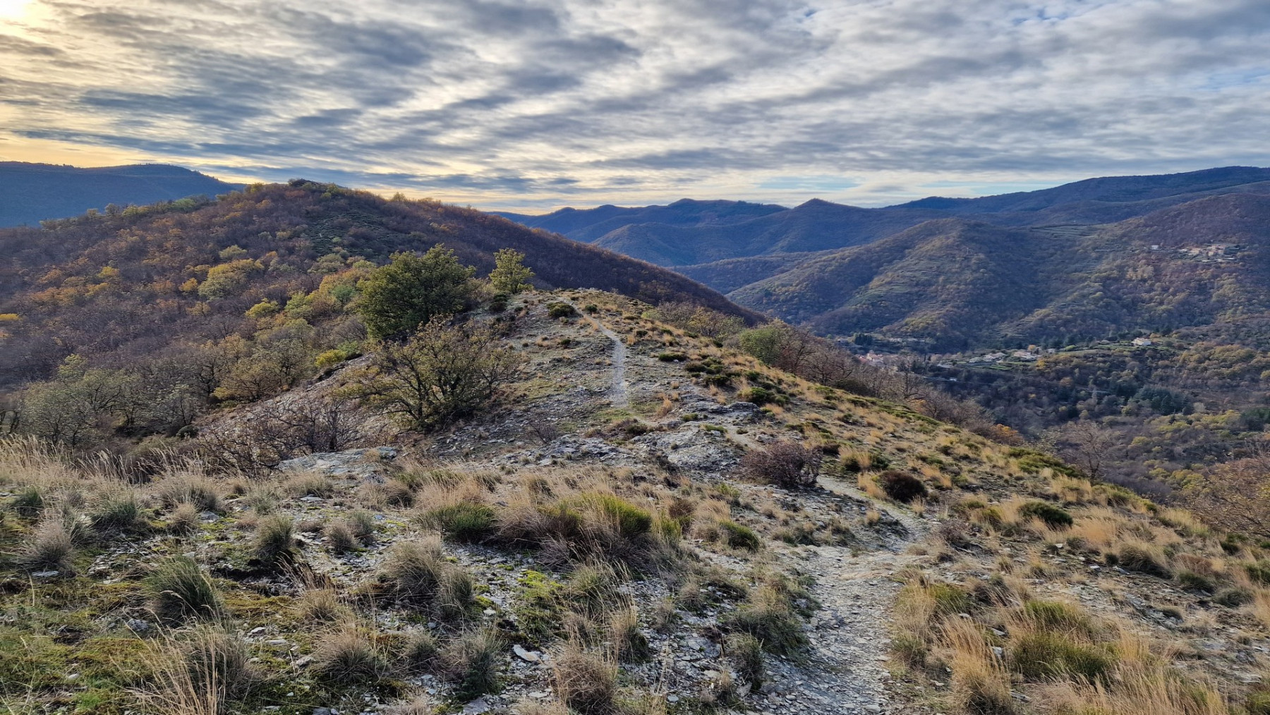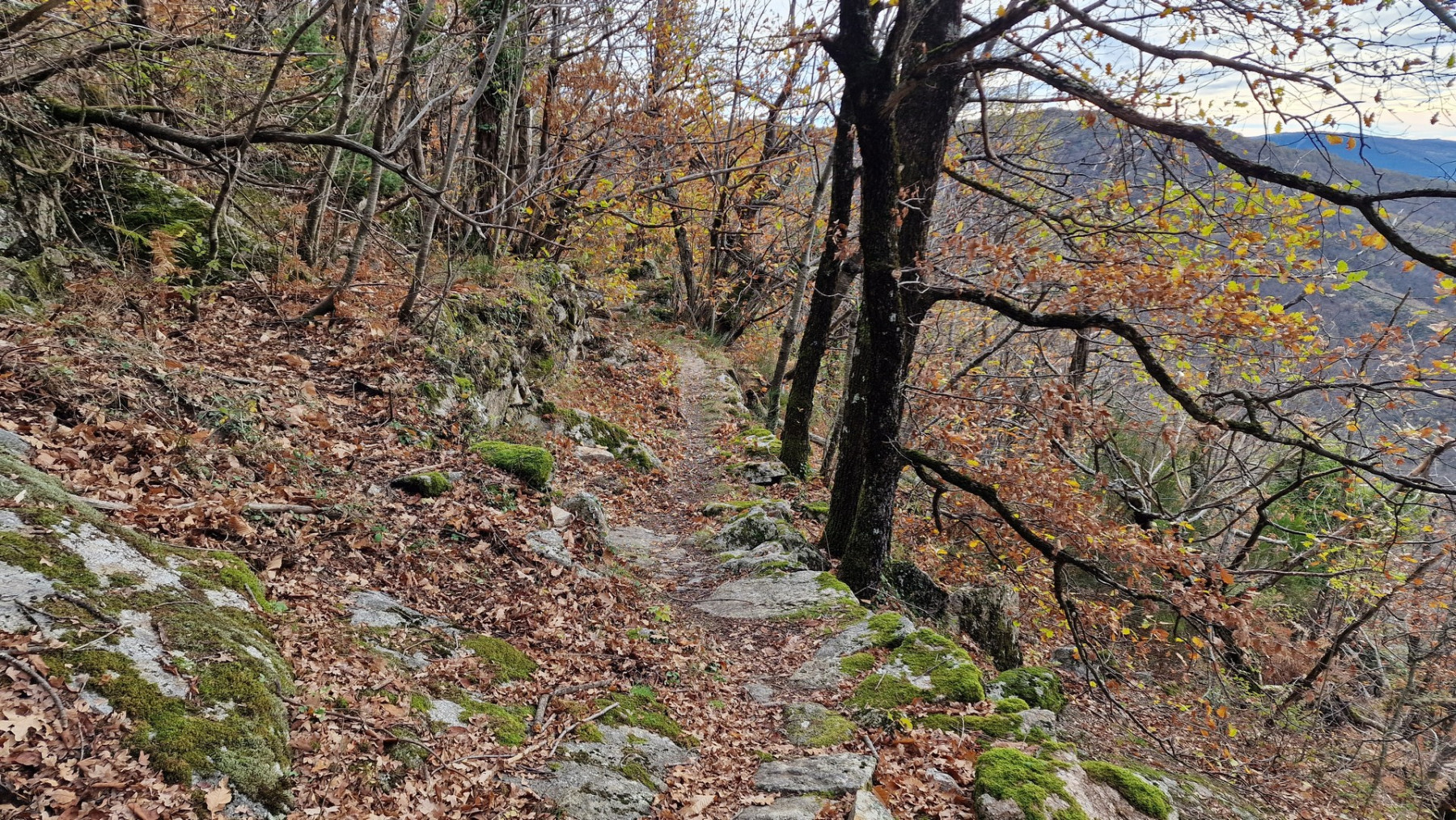 Bien que non VTTiste, je pense ne pas trop me tromper en vous disant que cela doit être sympa à faire en VTT : si l’on reprend ma carte en bas d’article avec le kilométrage, je dirais, de mémoire : passage le plus délicat un peu avant le Km 2 (juste avant le col) avec quelques “marches”, entre Km 3 et Km 4 le sentier (très beau) est quasiment caladé (mais ce n’est pas Paris-Roubaix) entre Km 4 à Km 8 piste ou sentier roulant, ainsi que toute la ligne de crête Km 8 à Km 11, la redescente en sentier Km 11 à Km 12 se fait en forêt avec un épais tapis de feuilles mais en dessous c’est plutôt de la terre, et pour finir la fin du parcours se fait sur l’ancienne voie de chemin de fer (sans rails et traverses avec un ballast de mémoire assez tassé !).
