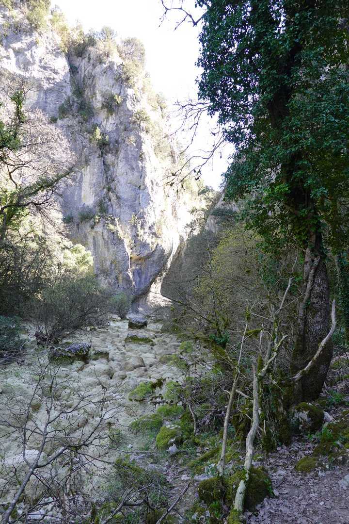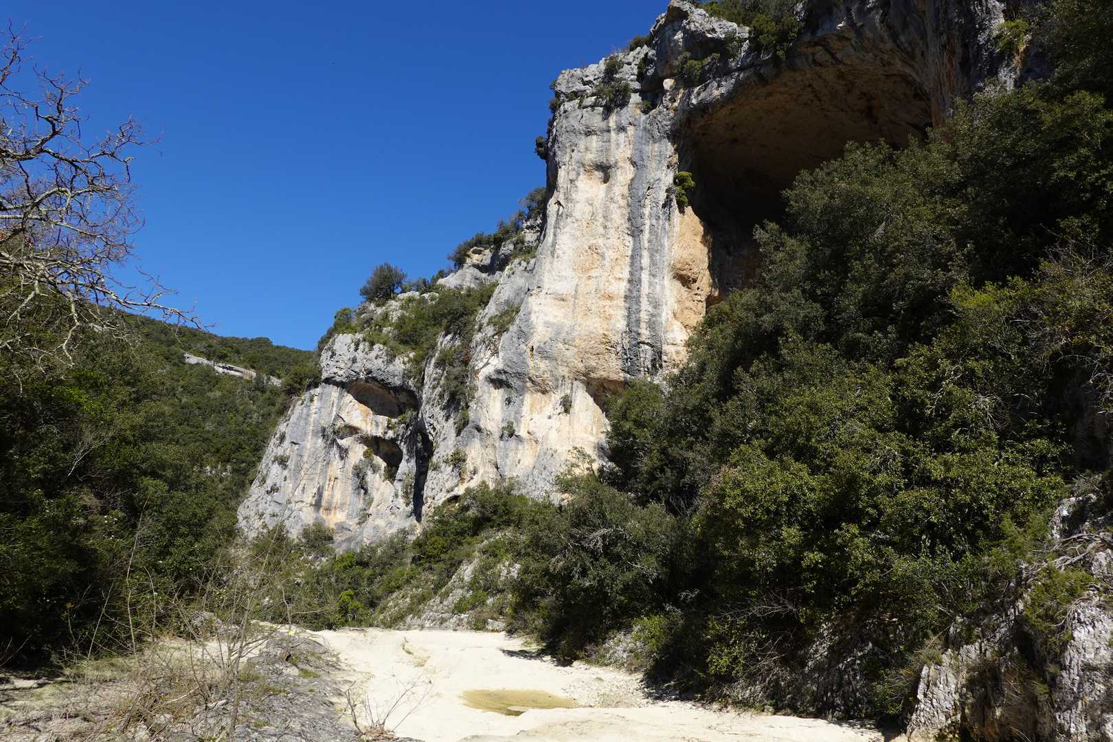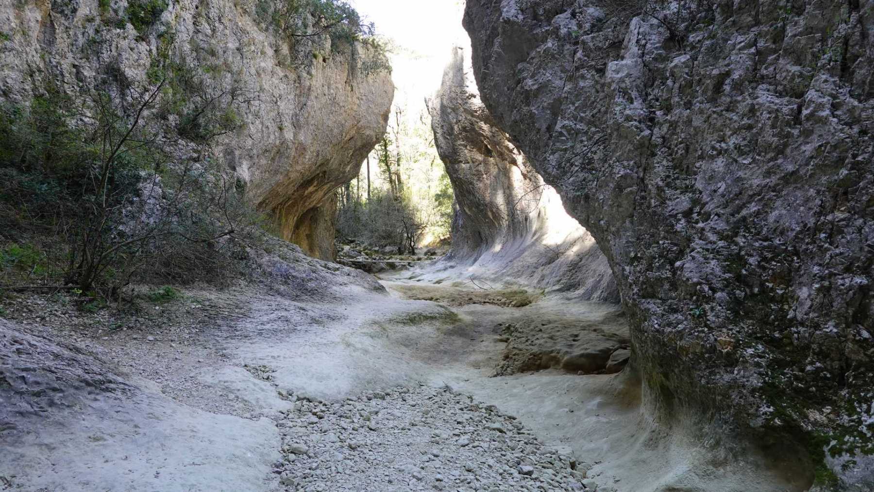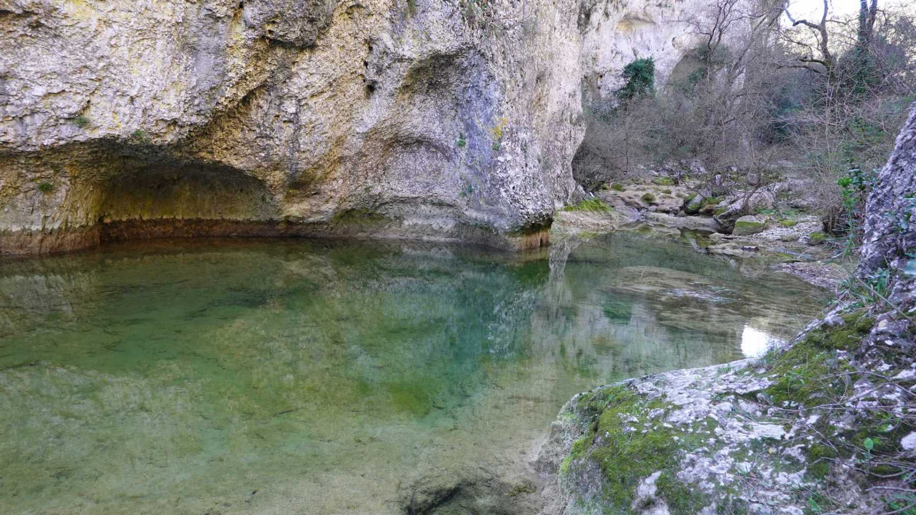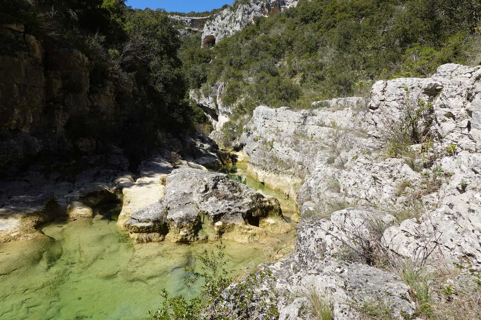 Au Km 2.1 (parking du site) débute le sentier très aménagé du belvédère qui mène aux Concluses. A cet endroit, franchir la balustrade en bois sur la gauche pour trouver un sentier qui vous permet de descendre dans les gorges. La progression dans le lit de l’Aiguillon, à sec pour l’essentiel, s’avère quelque peu sportive :