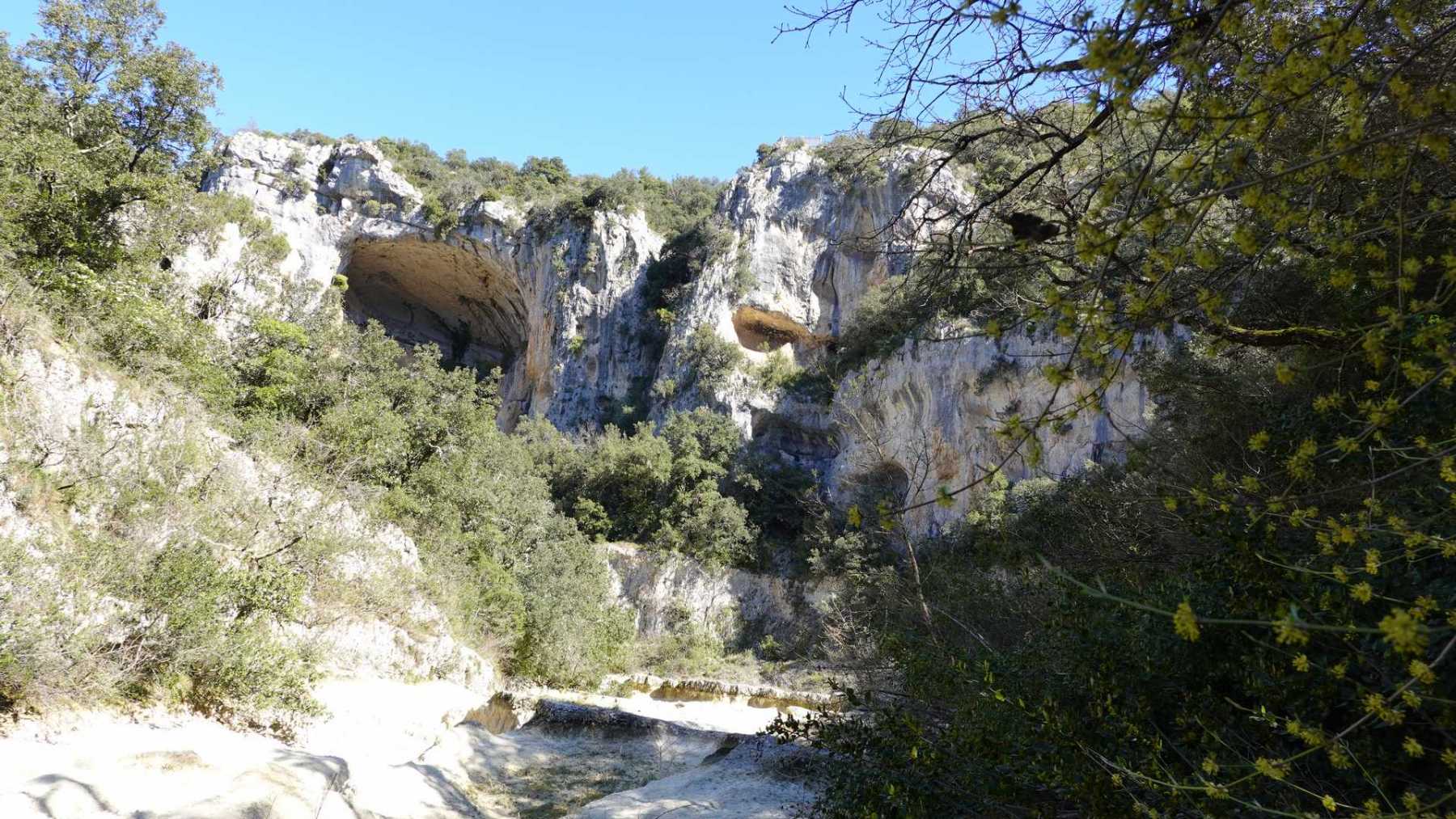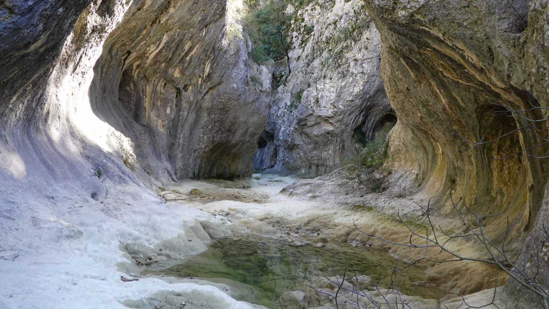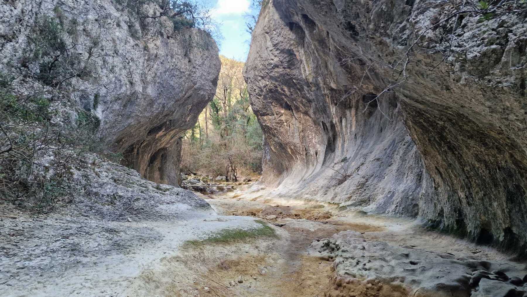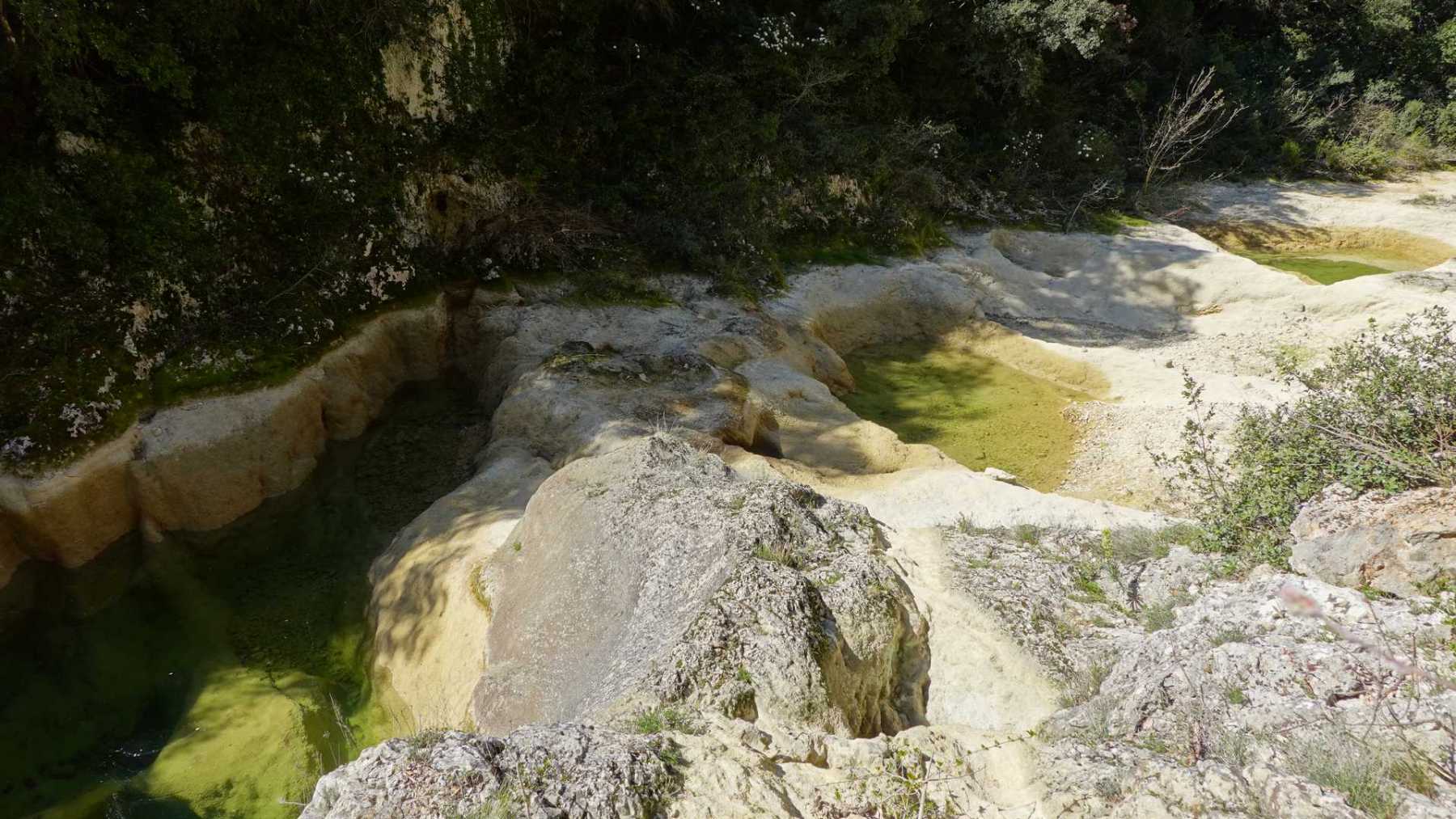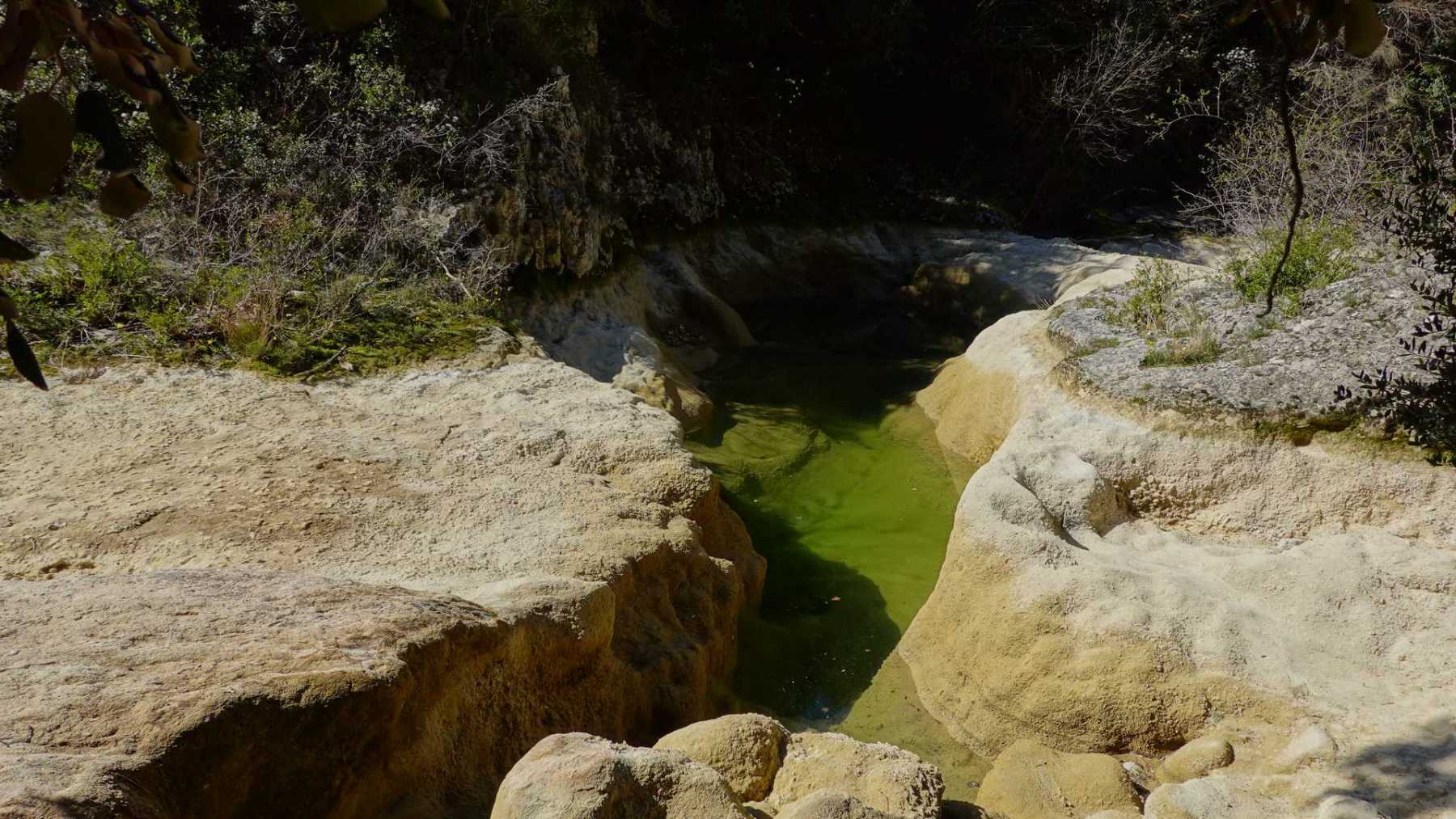 Au Km 2.1 (parking du site) débute le sentier très aménagé du belvédère qui mène aux Concluses. A cet endroit, franchir la balustrade en bois sur la gauche pour trouver un sentier qui vous permet de descendre dans les gorges. La progression dans le lit de l’Aiguillon, à sec pour l’essentiel, s’avère quelque peu sportive :