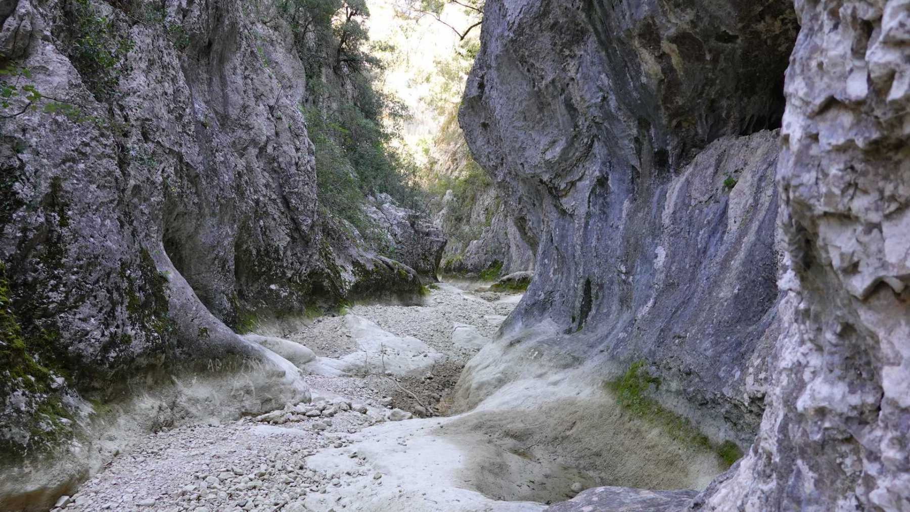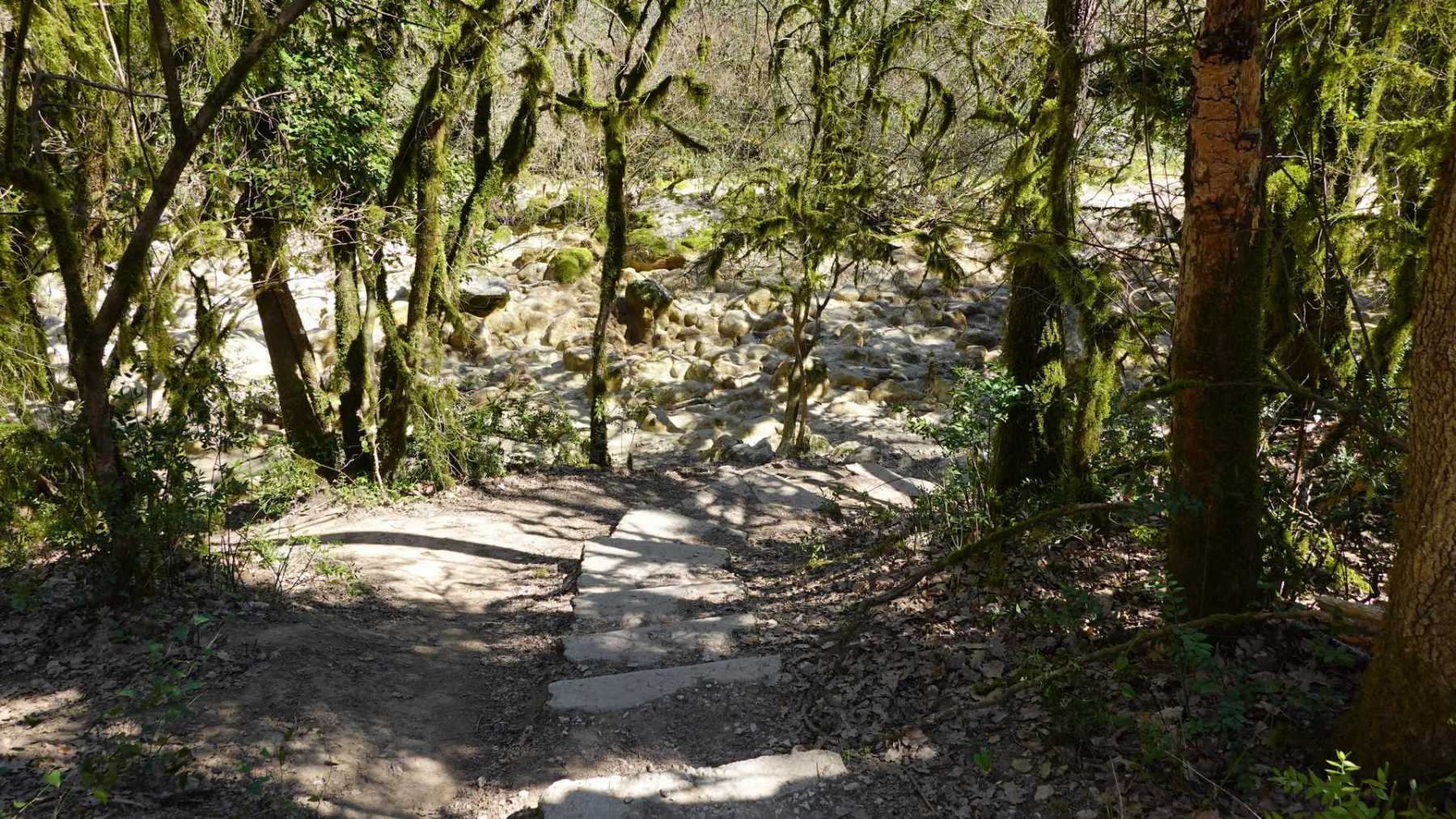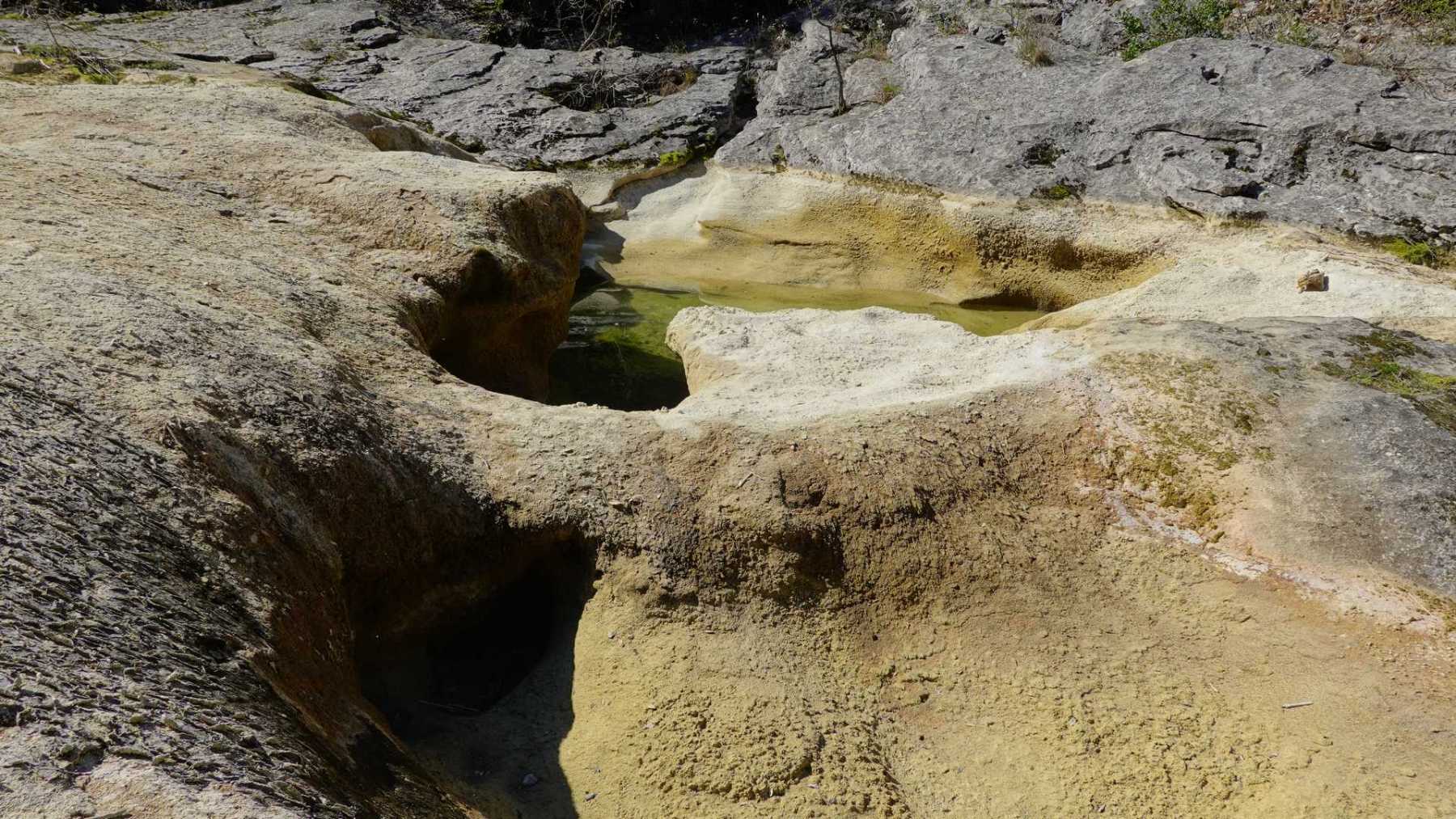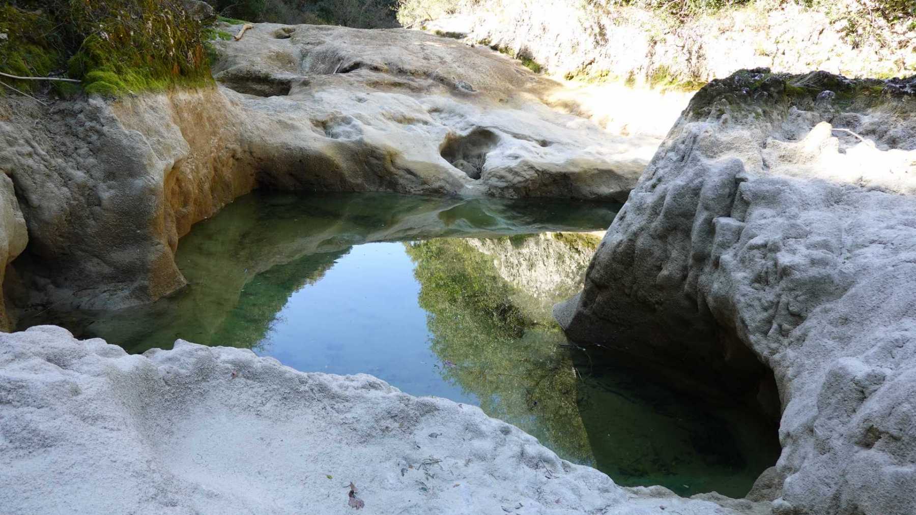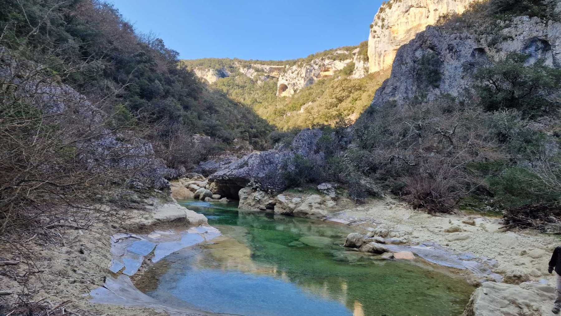 Au Km 2.1 (parking du site) débute le sentier très aménagé du belvédère qui mène aux Concluses. A cet endroit, franchir la balustrade en bois sur la gauche pour trouver un sentier qui vous permet de descendre dans les gorges. La progression dans le lit de l’Aiguillon, à sec pour l’essentiel, s’avère quelque peu sportive :