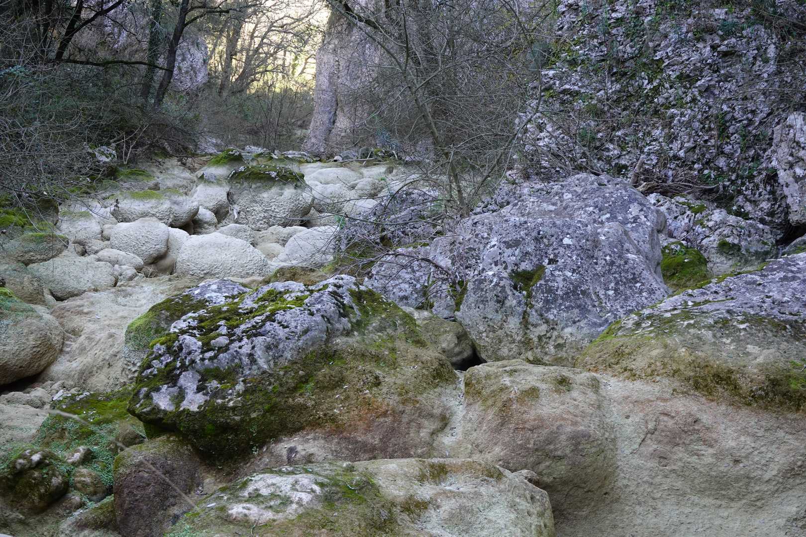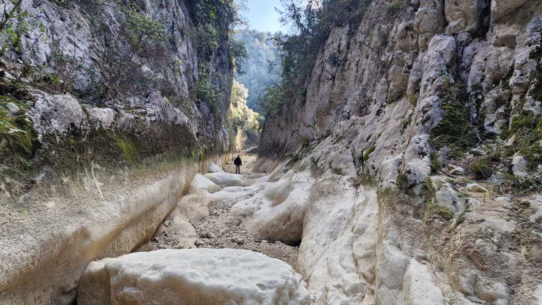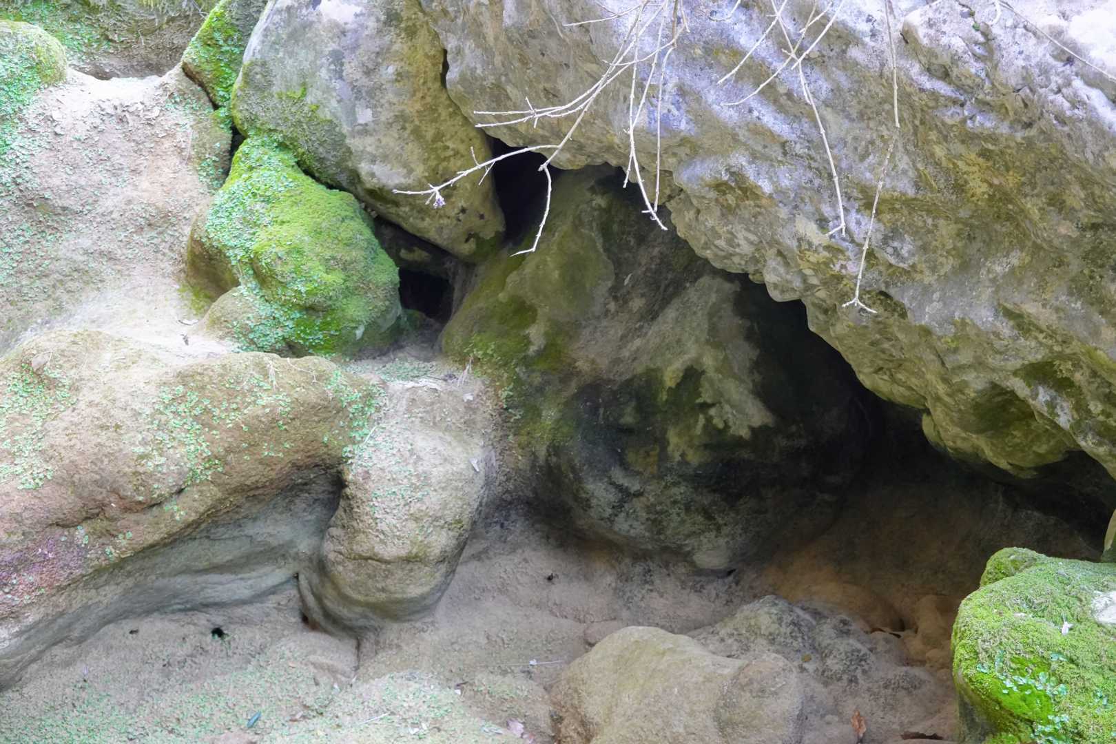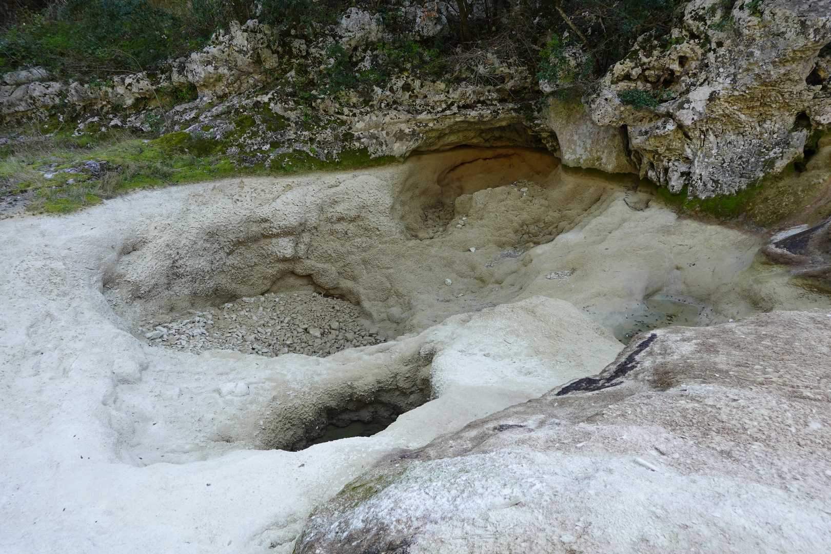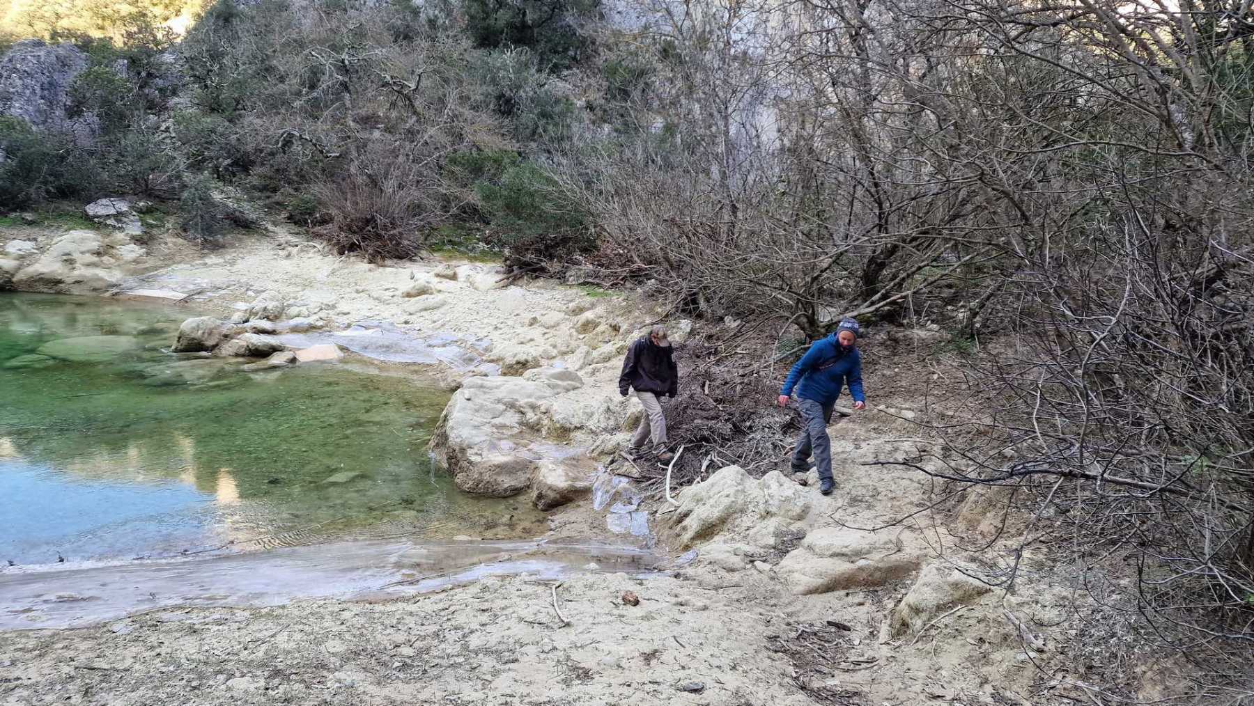 Au Km 2.1 (parking du site) débute le sentier très aménagé du belvédère qui mène aux Concluses. A cet endroit, franchir la balustrade en bois sur la gauche pour trouver un sentier qui vous permet de descendre dans les gorges. La progression dans le lit de l’Aiguillon, à sec pour l’essentiel, s’avère quelque peu sportive :
