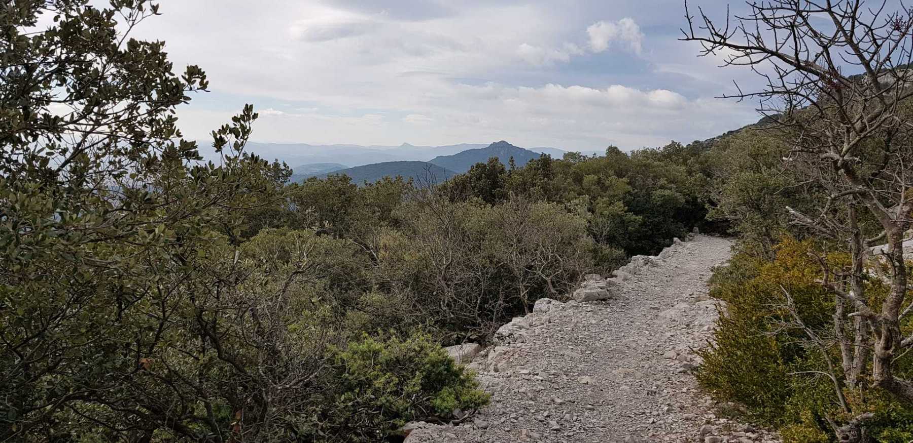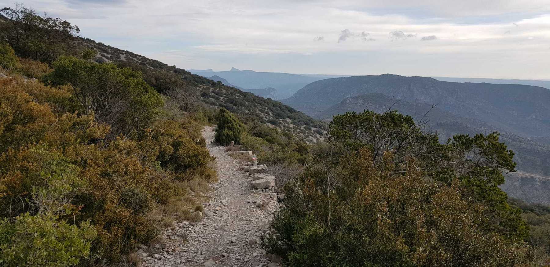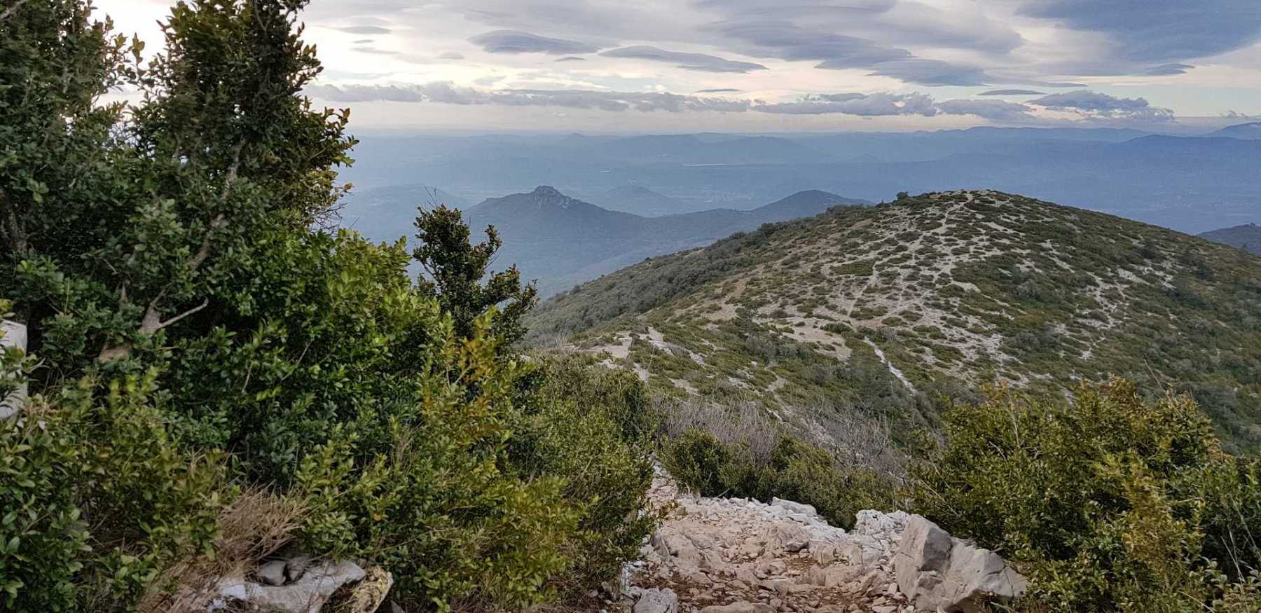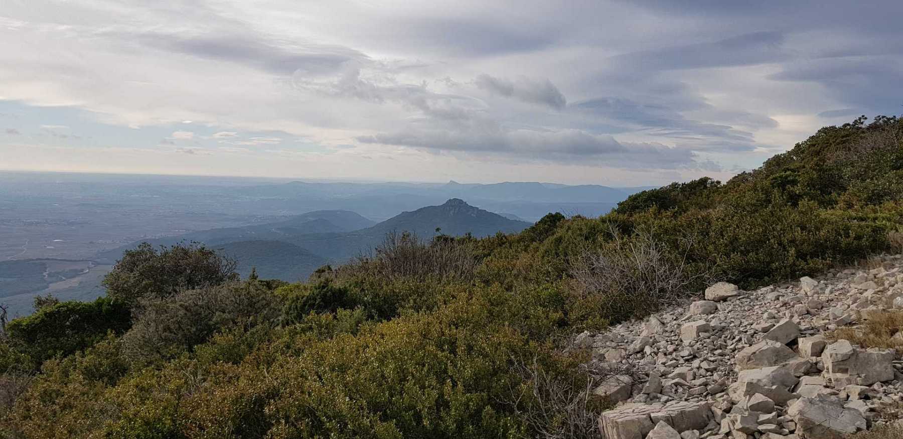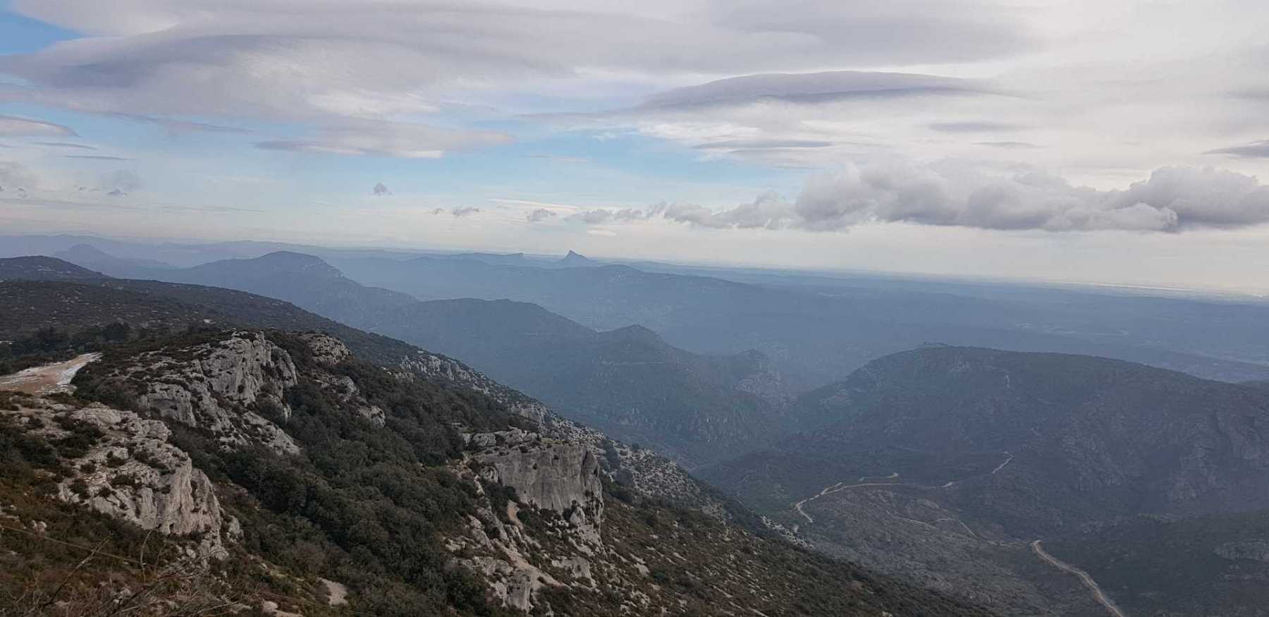 - Commentaires : Une belle journée d’hiver avec une météo inattendue sur le parcours : un froid de canard, un vent à décorner les bœufs et à vous couper le souffle au sommet et sur le plateau du Larzac, mais une très bonne visibilité (ce qui ne semble pas évident sur les photos) : des sommets enneigés du Ventoux au Canigou (en fait toute la chaîne des Pyrénées aux sommets enneigés allumée par le soleil), sans oublier les petits locaux : Massif de la Séranne, cirque de l’Infernet, Hortus, Pic St Loup, montagne Ste Claire, Massif de la Gardiole, rocher des 2 Vierges, Vissou, Liausson, Caroux. Montée en lacet sur le sentier très large et roulant du PR, puis petite portion en crête sur les bords du plateau du Larzac, redescente par un très beau sentier dans un cadre sauvage sous une forêt de chênes avec une progression dans le lit d’un ruisseau à sec assez sympathique !