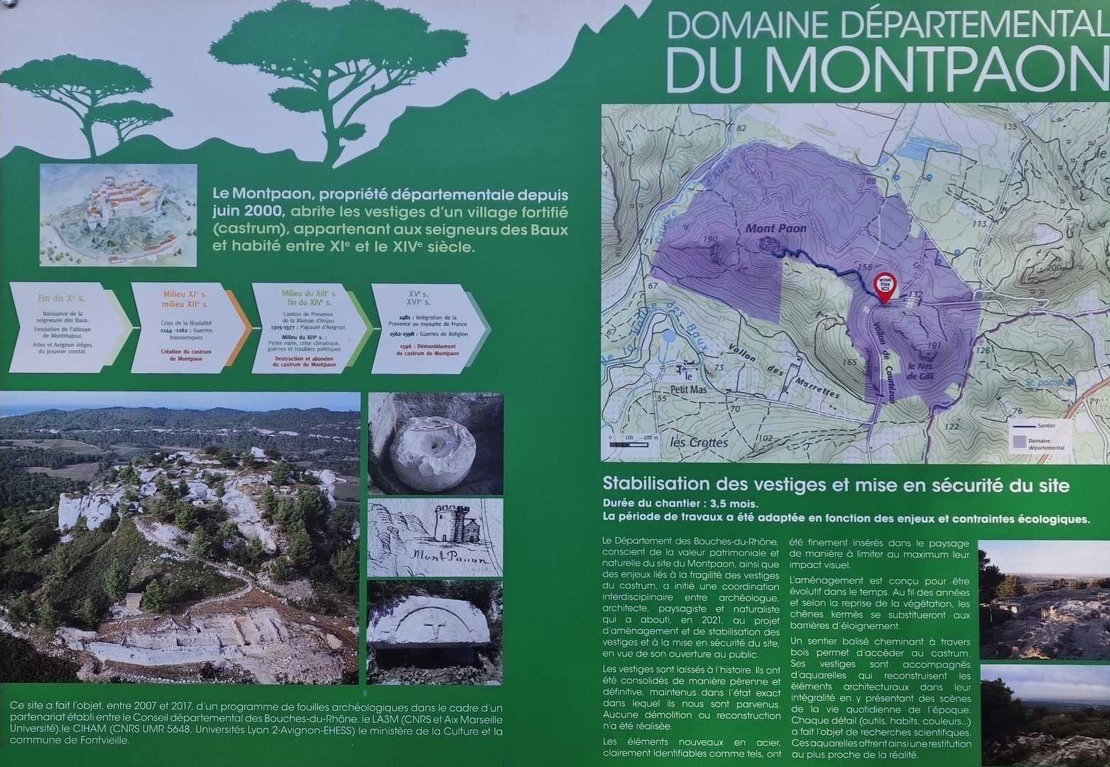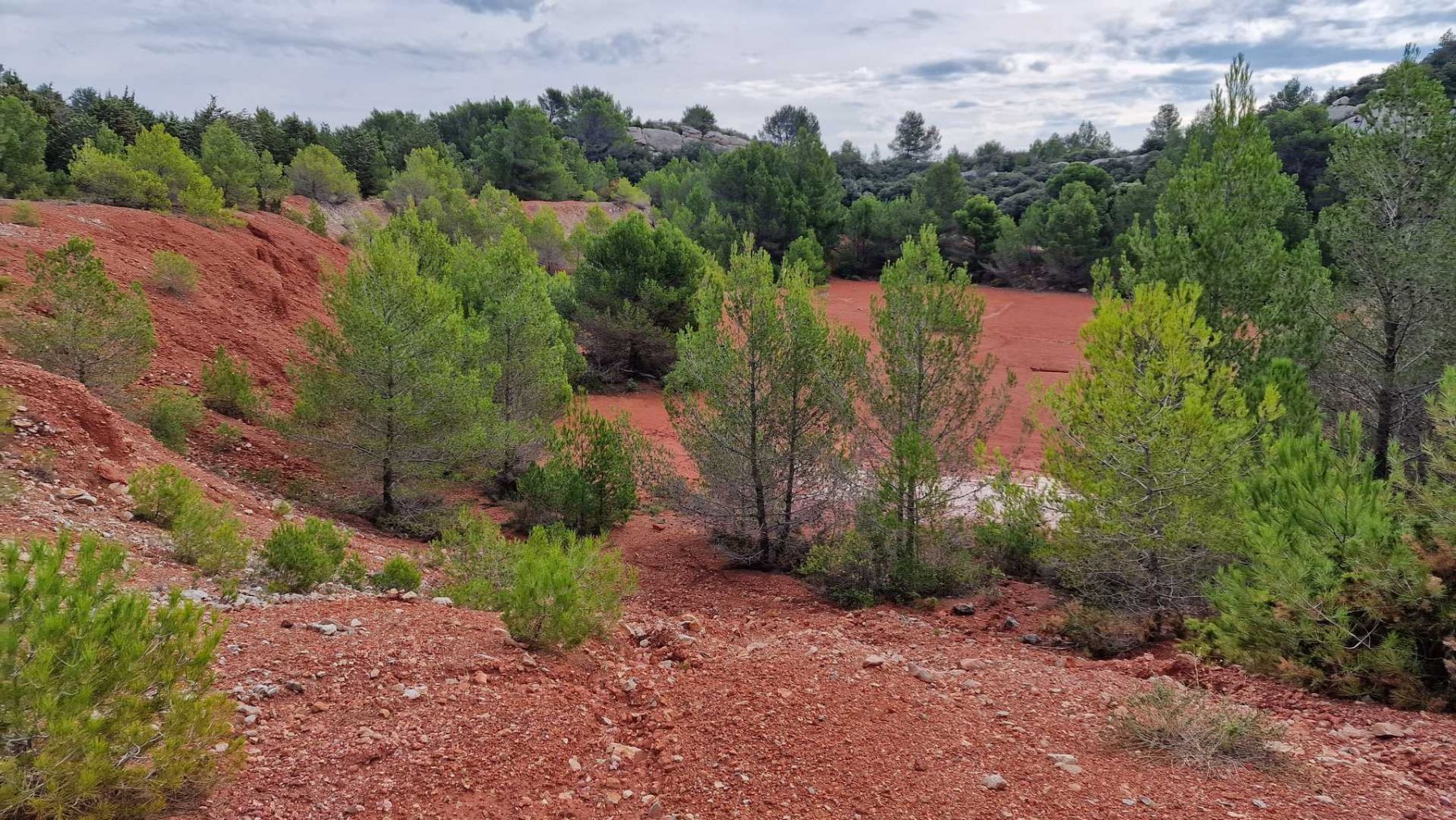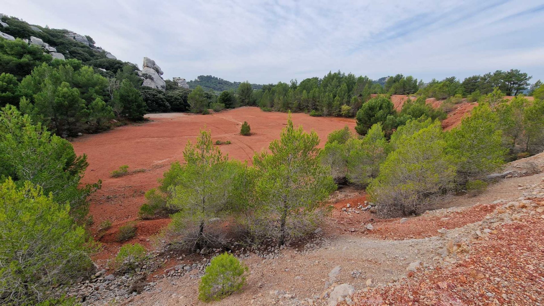 Un peu plus loin l’on contourne un 2ème site minier en forme de fer à cheval de couleur rouge puis un 3ème qui prend la forme d’une énorme et profonde balafre, tout en longueur, que l’on longe pendant 200 m (voir photo ci-dessous) - Ensuite, escalade du Mont Paon, pour visiter son Castrum (ruines d’un village fortifié moyenâgeux) et profiter de très belles vues à 360° sur toute la région. En particulier à l’est vers les Baux que nous rejoindrons en fin de balade.
