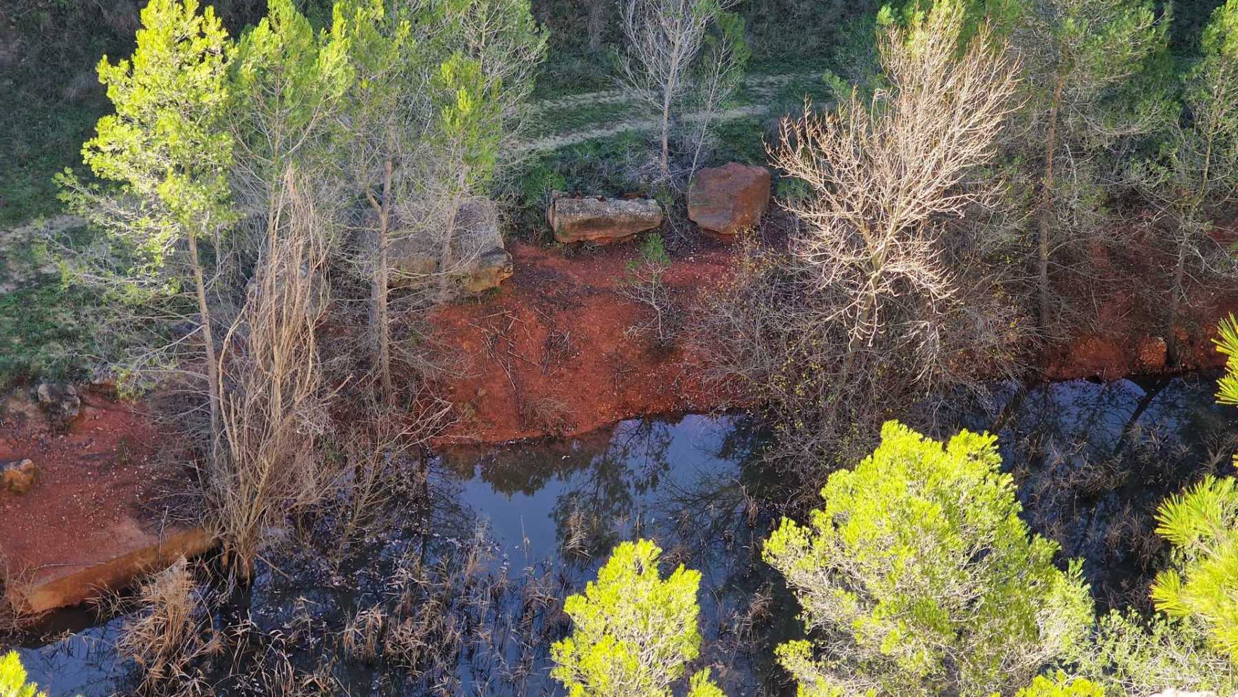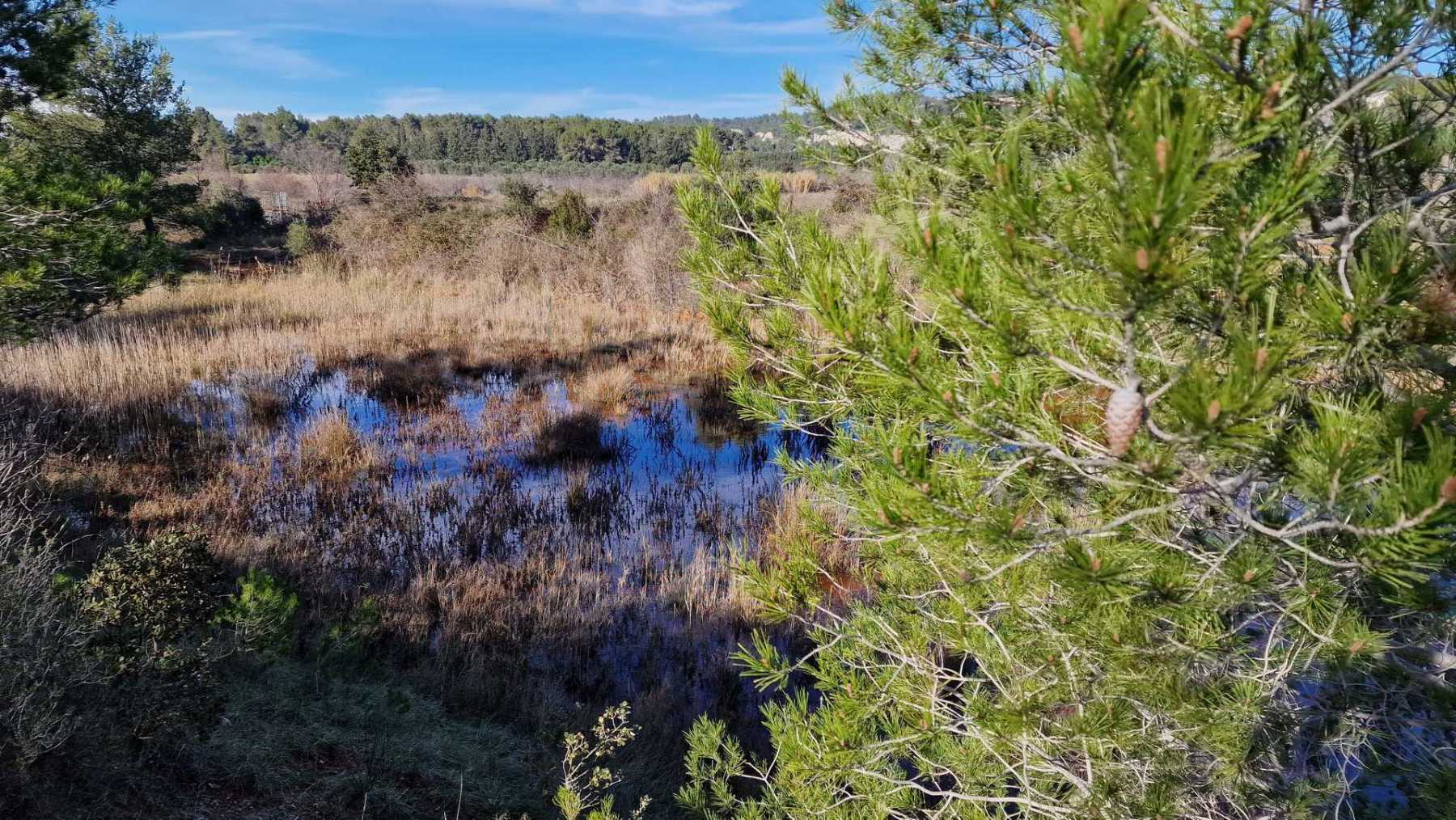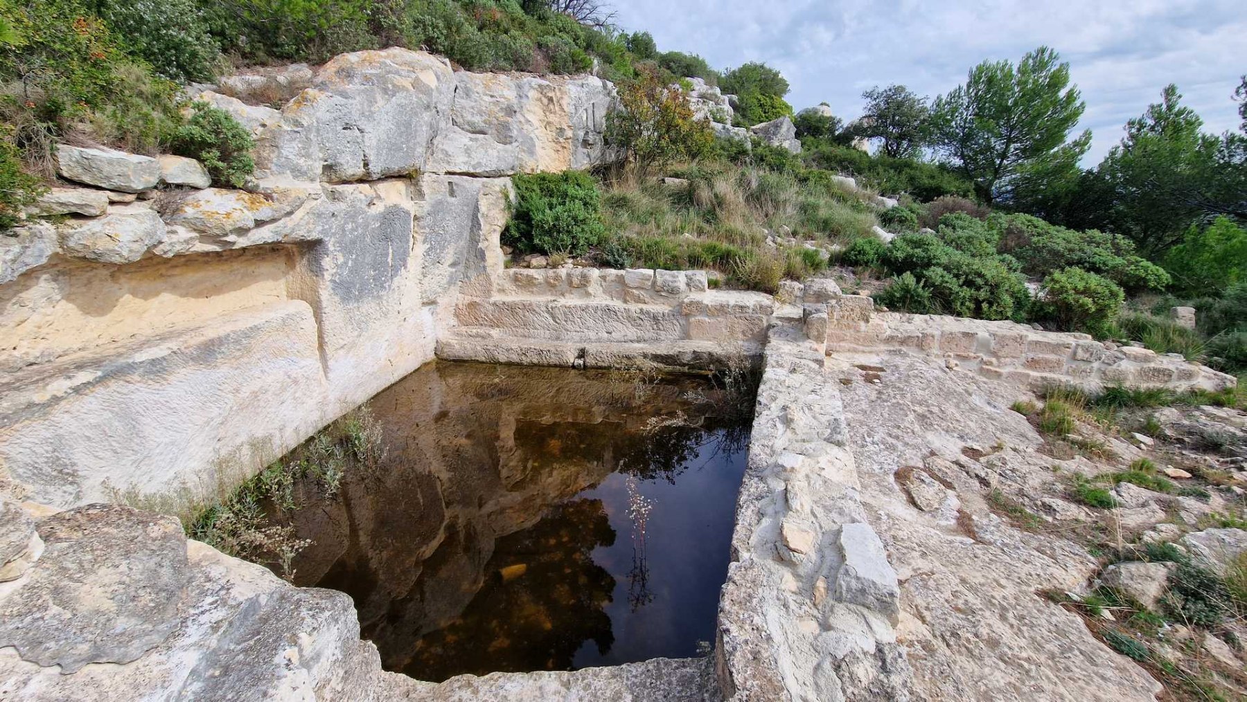 - Dans la descente, l’on rejoint une belle pinède que l’on quittera pour se retrouver dans une zone énigmatique avec d’anciens bassins (bassins de décantation en rapport avec l’activité miniaire – vestiges d’un élevage piscicole ?) et également les restes d’un ancien parcours complet d’équitation dont les écuries et là aucun doute, on été récupéré par la S.P.A. des Baux et cela s’entend !!)..