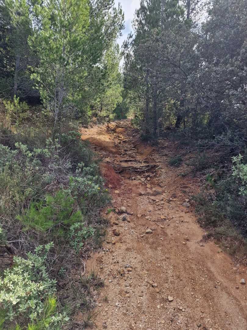 Quasiment 50 % de sentiers ( cf carte en bas d’article) pour cette randonnée avec de nombreuses bifurcations nécessitant une certaine vigilance** comme :1. Au départ, le parcours traverse l’oliveraie (derrière l’hôtel) afin de vous amener directement sur l’entrée de la 1ère mine (attention, on peut passer à côté sans la voir => bien suivre la trace !).