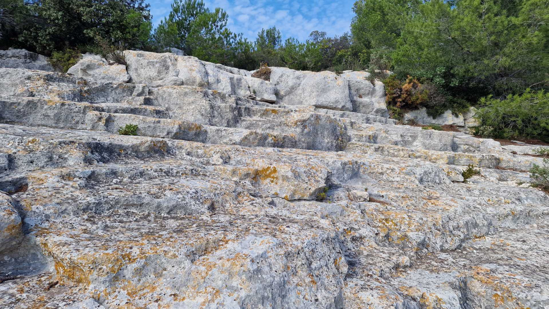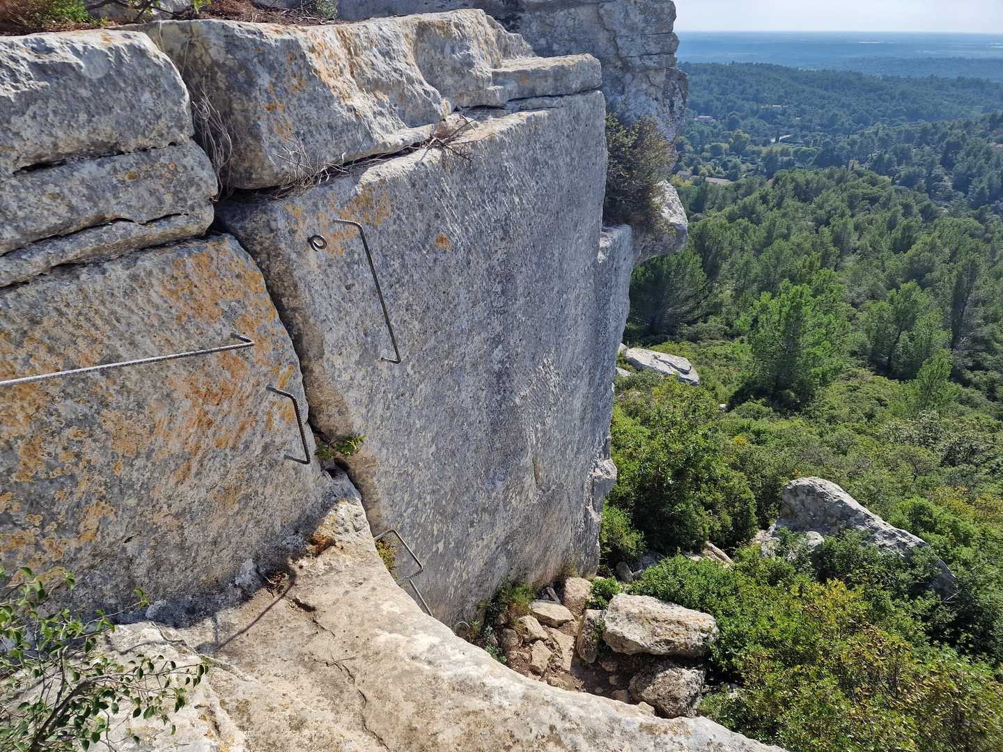 4. Dans le val suivant (Km 9,1), il faut monter sur la gauche sur la très vaste table rocheuse ! A son point haut, on retrouve un sentier qui vous mène à une petite échelle bienvenue pour se retrouver sur un plateau avec une vue imprenable sur le village des Baux !