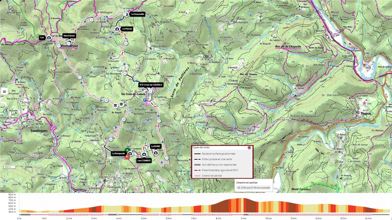 • Commentaires  :    Pas de surprise en haut du Mont Brion : Vue très limitée. Mais en chemin de belles surprises comme un menhir, le beau village de Sainte Croix de Caderle, une belle cascade et pour redescendre du col de Briontet des sentiers très sympathiques offrant de belles vues et souvent très roulants (remarquables dans cette zone).