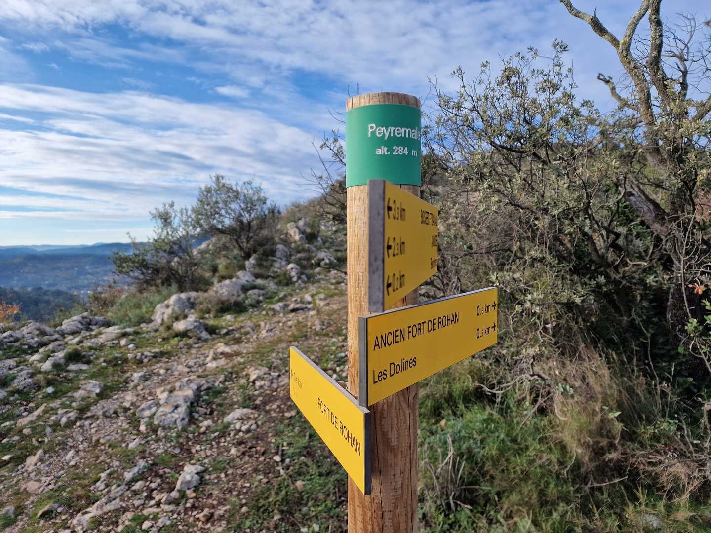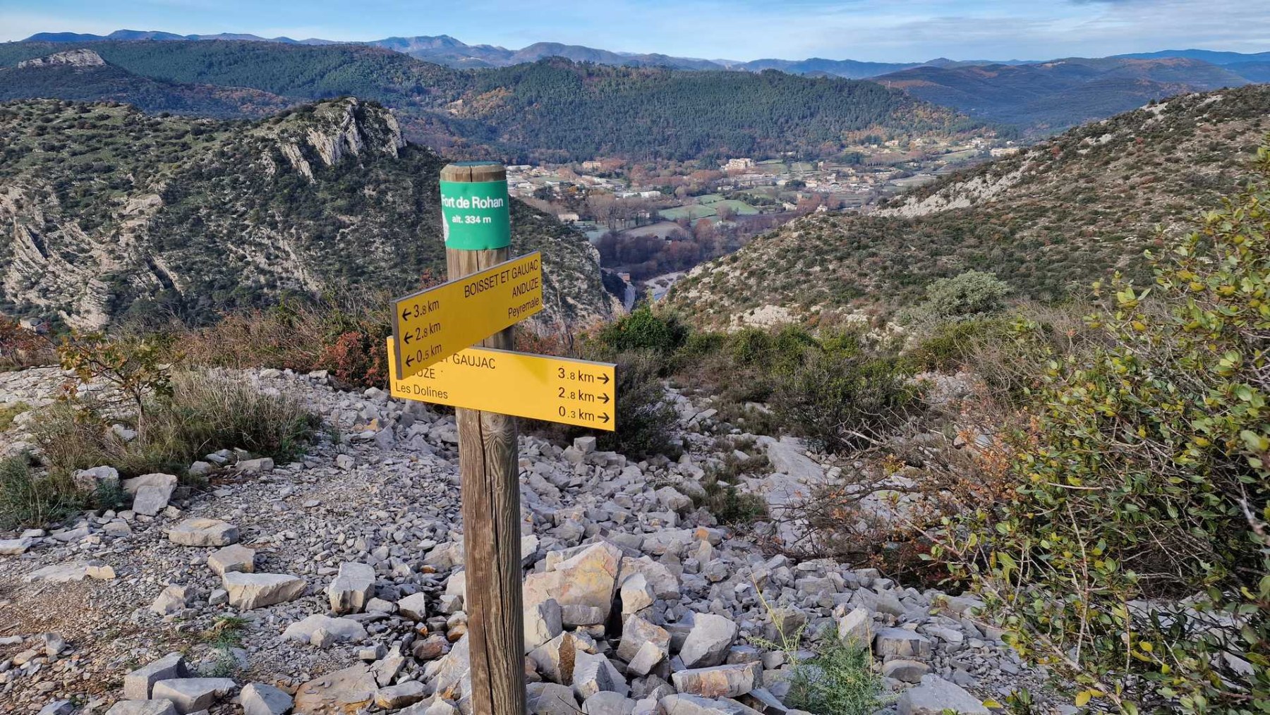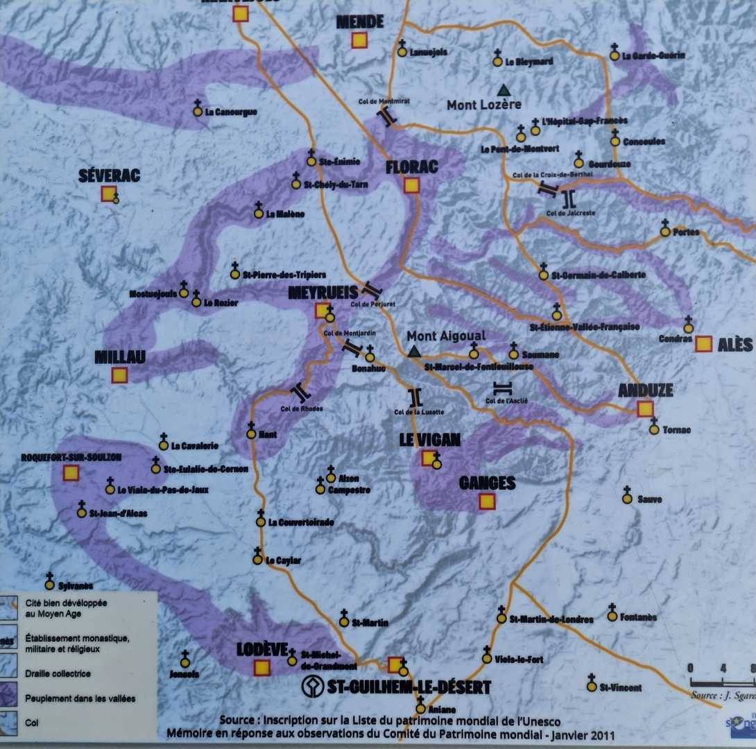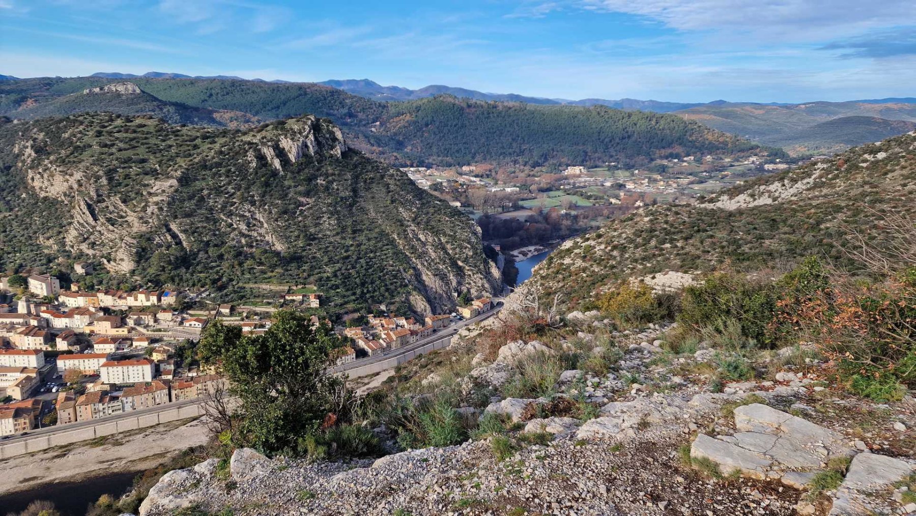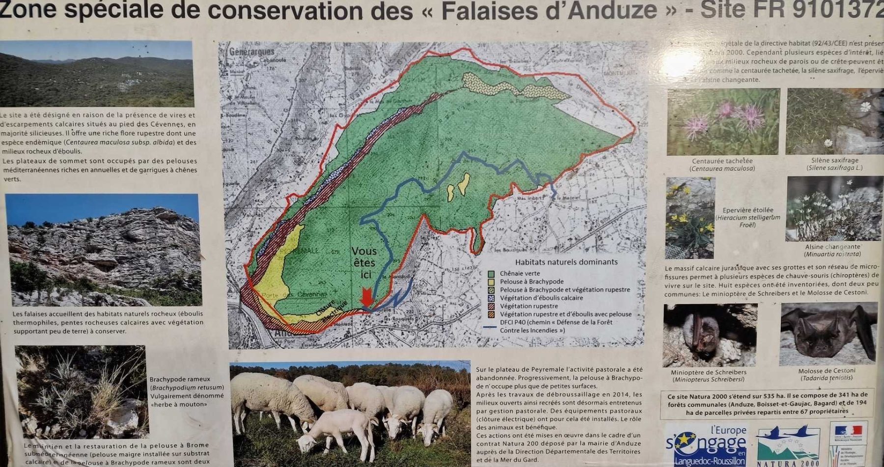• Commentaires  :    Anduze : Porte des Cévennes : au propre comme au figuré, les montants de la porte étant constitués par la falaise de Saint-Julien à l’ouest et la falaise de Peyremale à l’est. C’est le sommet de cette dernière que nous explorerons en début de randonnée. Ce qui offrira un très beau panorama sur les sommets des Cévennes, la vallée du Gardon de Saint-Jean et la ville d’Anduze 200 mètres plus bas.