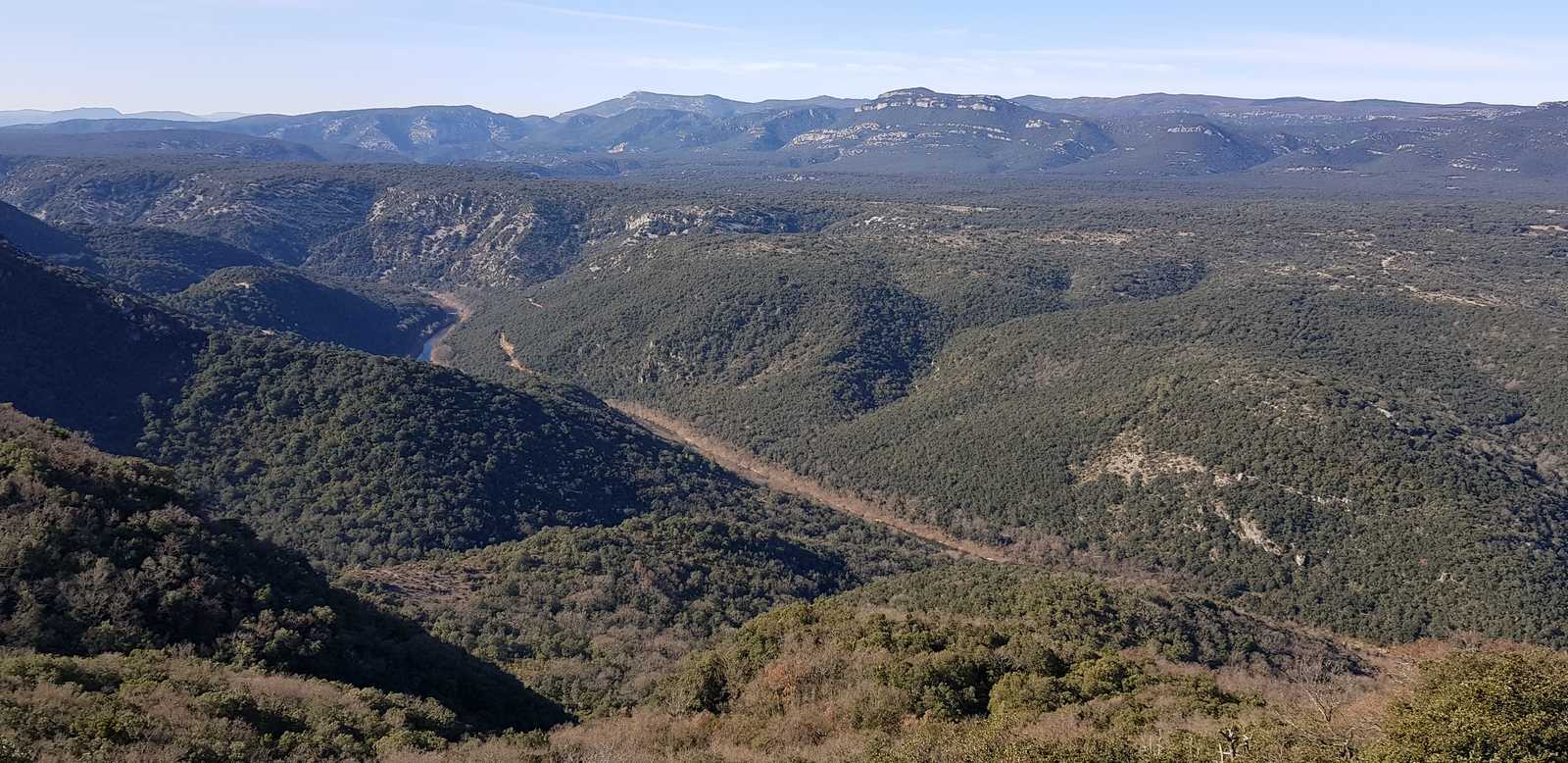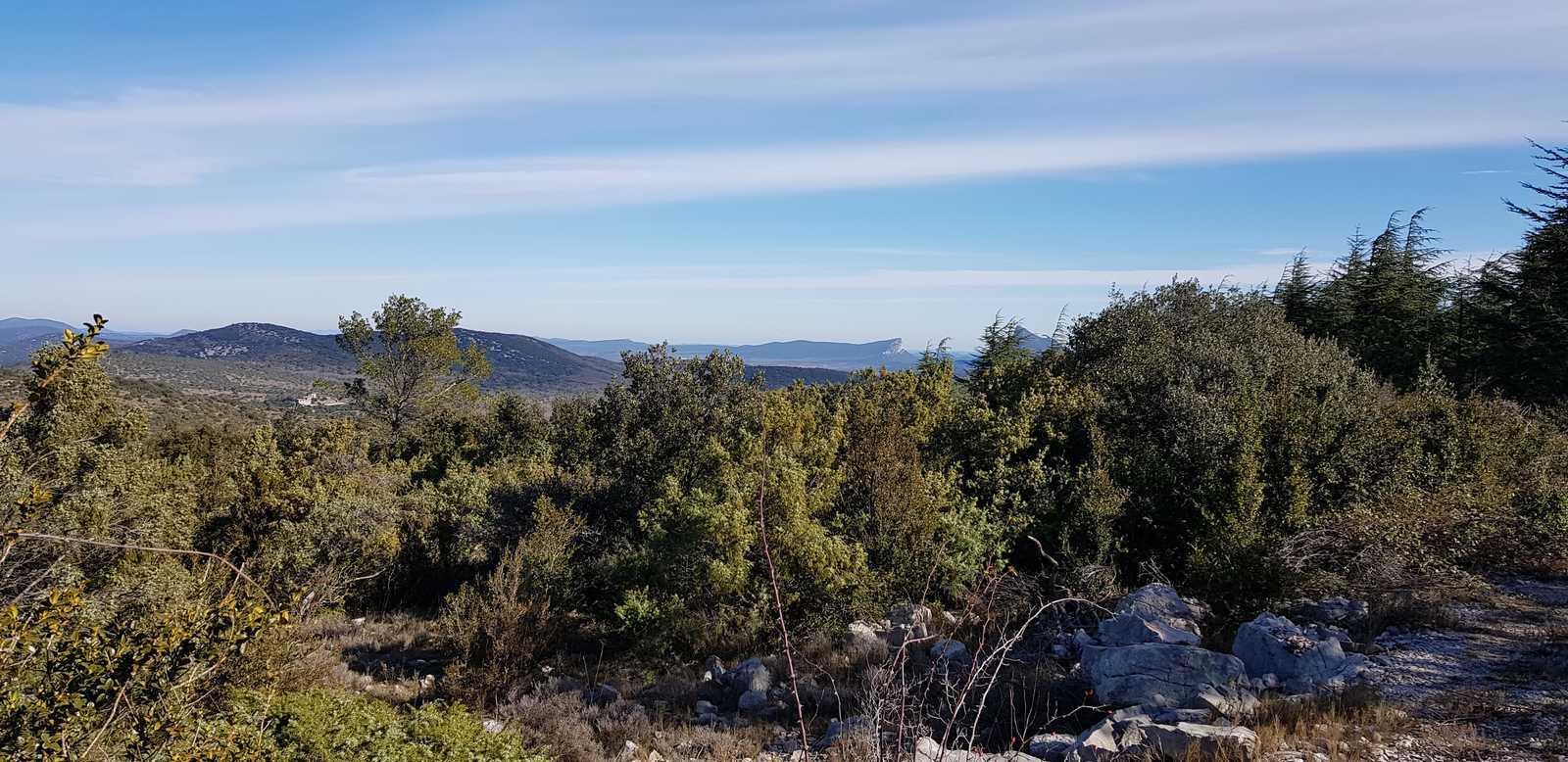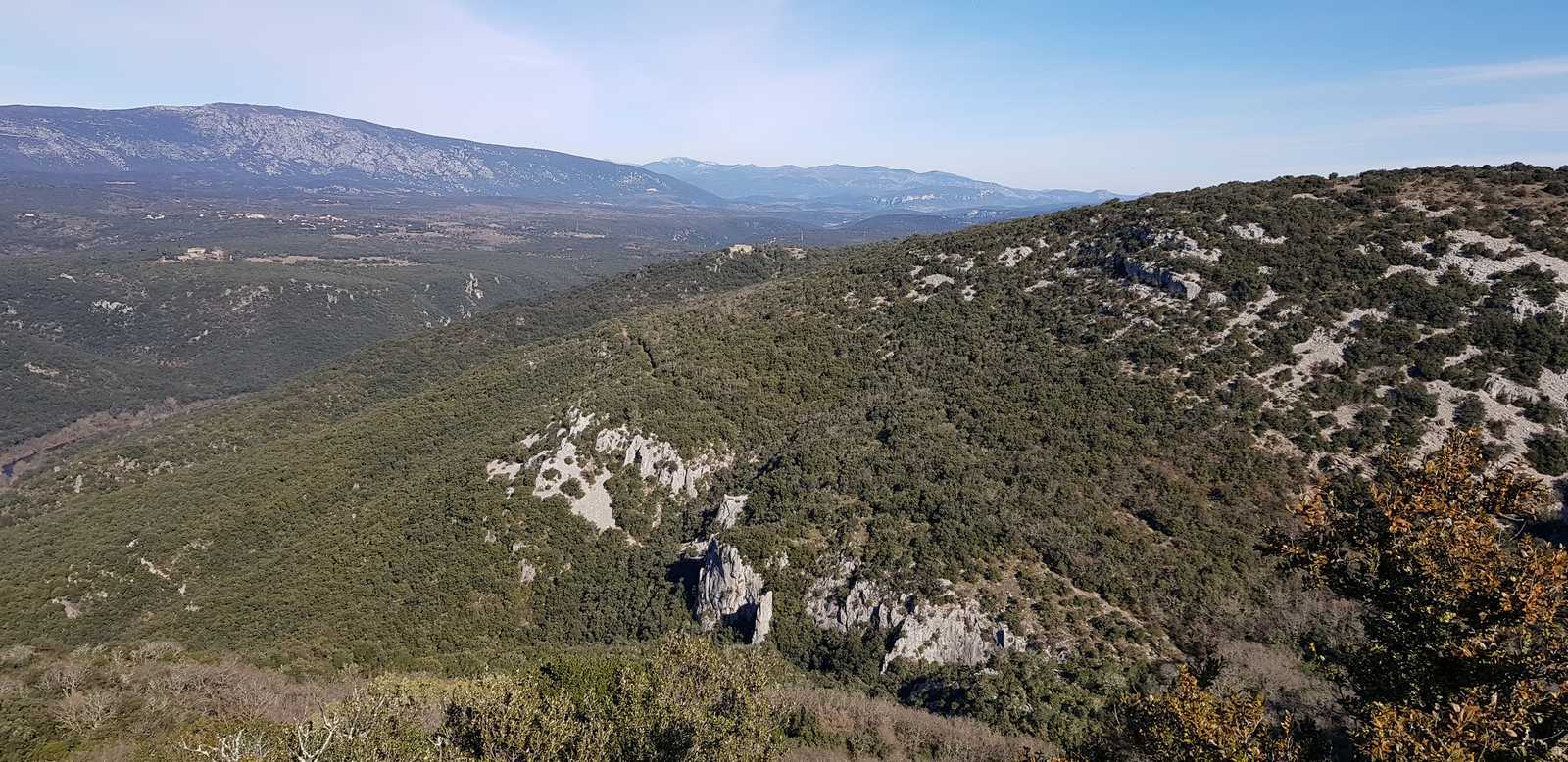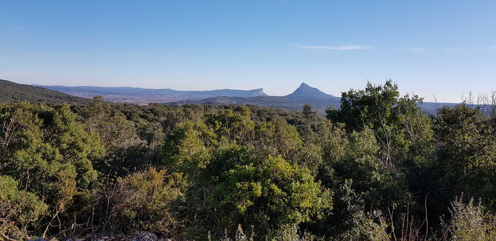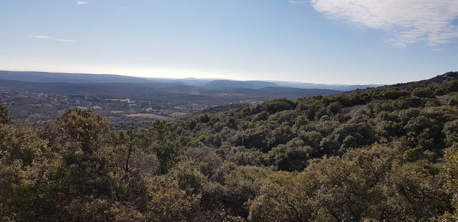 1. la vue proposée au sommet de la Sellette : si le temps est degagé vous apercevez à l’est : Hortus et Pic St Loup et Ventoux, vers le sud la mer et à l’ouest la chaîne des pyrenéées et le massif du Haut Languedoc.